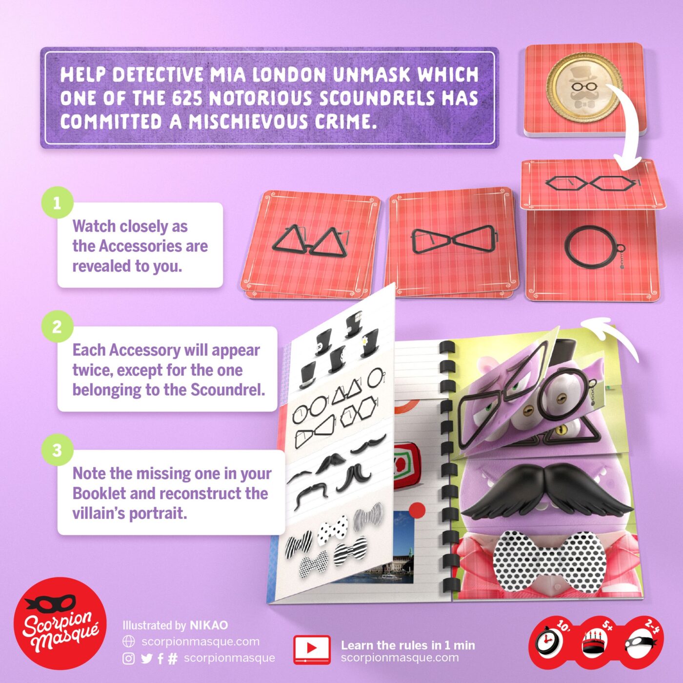Each player must identify these in their Investigation Booklet. The player who correctly identifies the greatest number of the Scoundrel’s accessories is the winner!