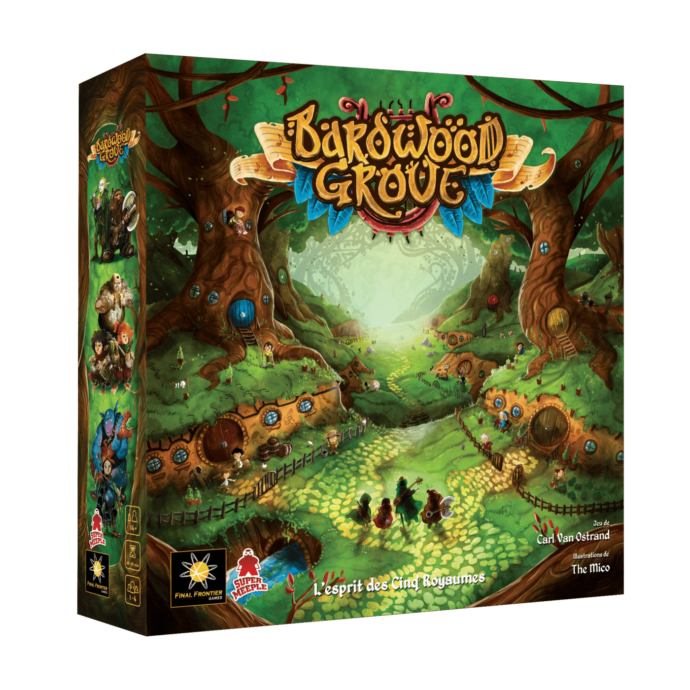 Bardwood Grove est un Eurogame de construction de tableau dans lequel chaque joueur endosse le rôle d’un barde fantasque qui cherche à se faire un nom. Dans ce jeu, les joueurs vont pouvoir s’aventurer au-delà des frontières nouvellement ouvertes et atteindre la légendaire cité mélodieuse de Bardwood Grove, située dans les Cinq Royaumes (La Baie des Marchands, Rise to Nobility, Cavern Tavern...) etc plus précisément au coeur du Royaume des Halfelins. Ici, les arbres du bois des bardes font d’excellents instruments et les formations cristallines naturelles ont des propriétés sonores uniques.En tant que barde, vous gérez un mécanisme unique de cadran de tempo pour créer des chansons. À chaque tour, vous piochez deux cartes et devez décider laquelle défausser pour gagner des avantages instantanés, et laquelle ajouter à votre chanson.