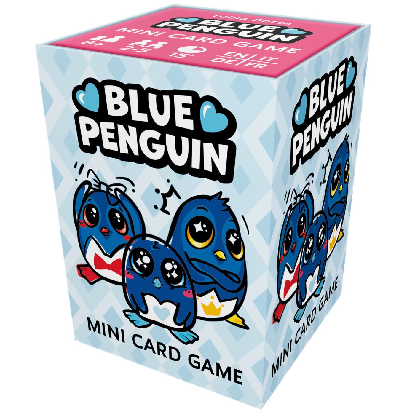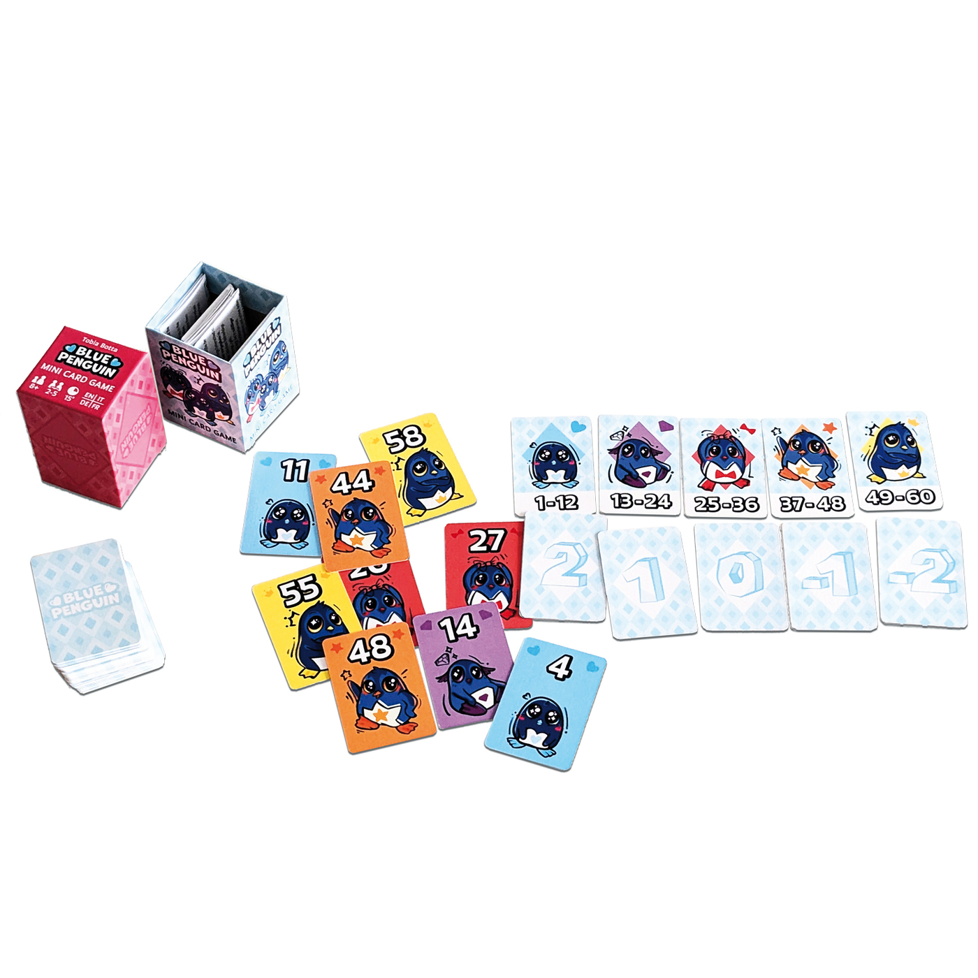 Dans Blue Penguin, chaque joueur essaie d'attirer les pingouins les plus mignons : plus ils sont petits, plus ils sont mignons ! Le problème, c'est que les pingouins suivent toujours les plus grands. À son tour, chaque joueur pose une carte « pingouin » et en pioche une nouvelle. Le joueur qui pose la carte avec le numéro le plus élevé récupère toutes