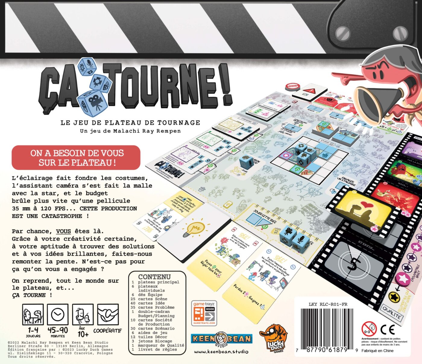 Dans ce jeu coopératif, œuvrez ensemble à la création du meilleur film possible! À votre tour, vous assignez à l’équipe différentes actions sur le plateau principal, sur votre plateau individuel, ou dans le Studio, pour filmer des Scènes. Vous gagnez si vous terminez un film de Qualité ou s’il est Tellement Nul que cela en devient Génial! Vous perdez si vous manquez de temps ou d’argent pendant la production, ou si votre film est de Qualité médiocre.