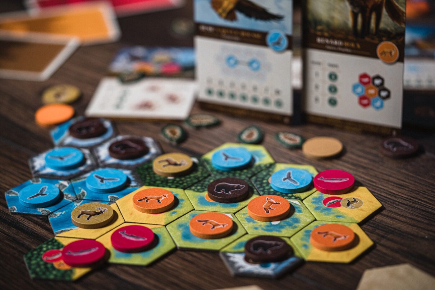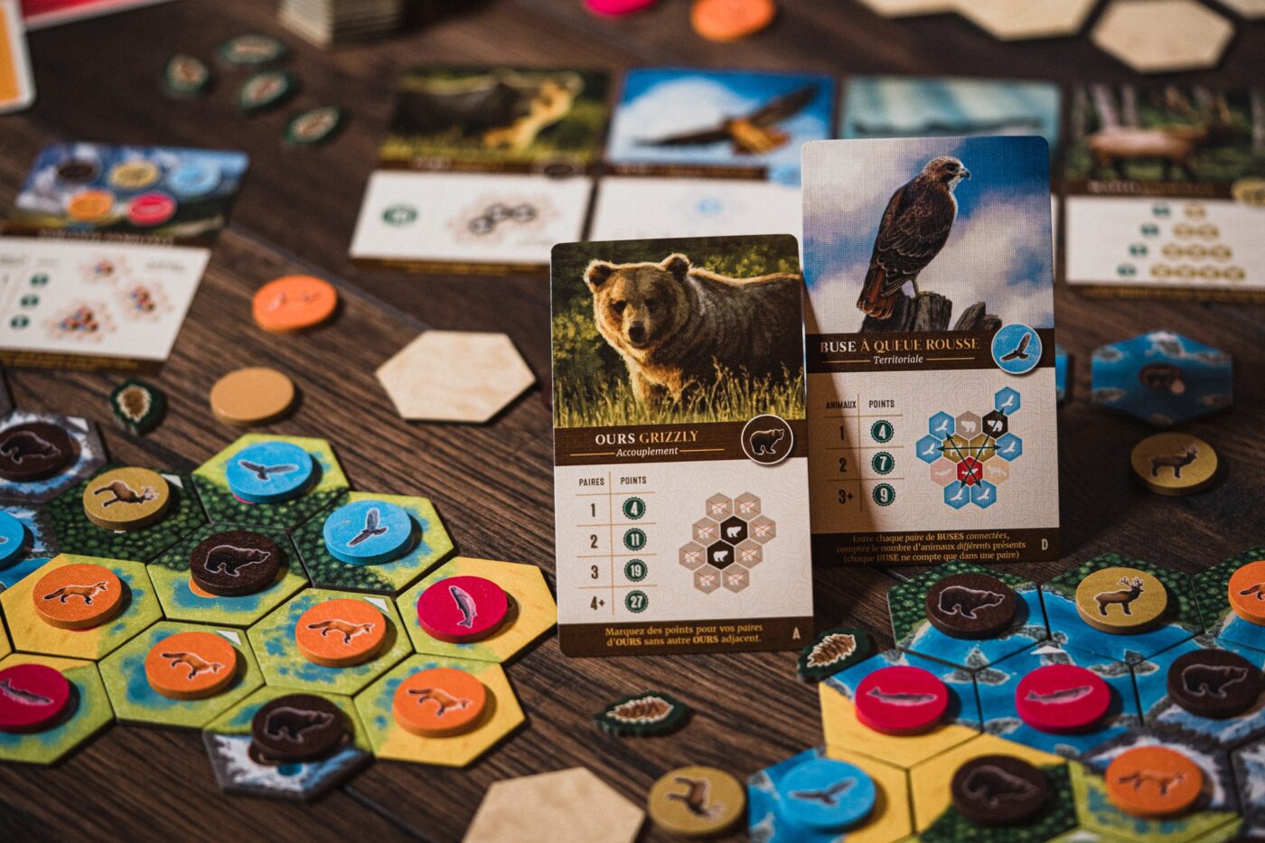 Les joueurs doivent ainsi créer un écosystème diversifié et harmonieux car chaque espèce possède des préférences de zone, et chaque habitat doit être placé judicieusement pour réduire la fragmentation et scorer du mieux possible. Cascadia propose un puzzle en 2 temps qui évoluent au fil du temps au fur et à mesure que les habitats et la faune sont ajoutés à l’écosystème de chaque joueur. Les joueurs marquent des points en créant les espaces fauniques les plus harmonieux,mais aussi les plus larges.