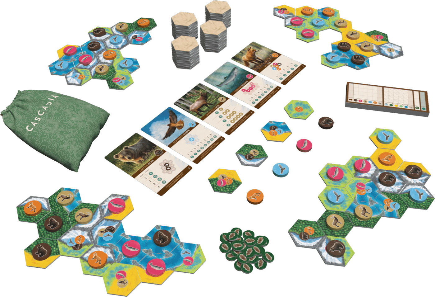 Cascadia est un jeu à base d’assemblage de tuiles et de draft de jetons mettant en scène les habitats et la vie sauvage du Nord Ouest du Pacifique. Au fur et à mesure des tours, les joueurs construisent leur propre zone de terrain et la peuplent avec la faune disponible.