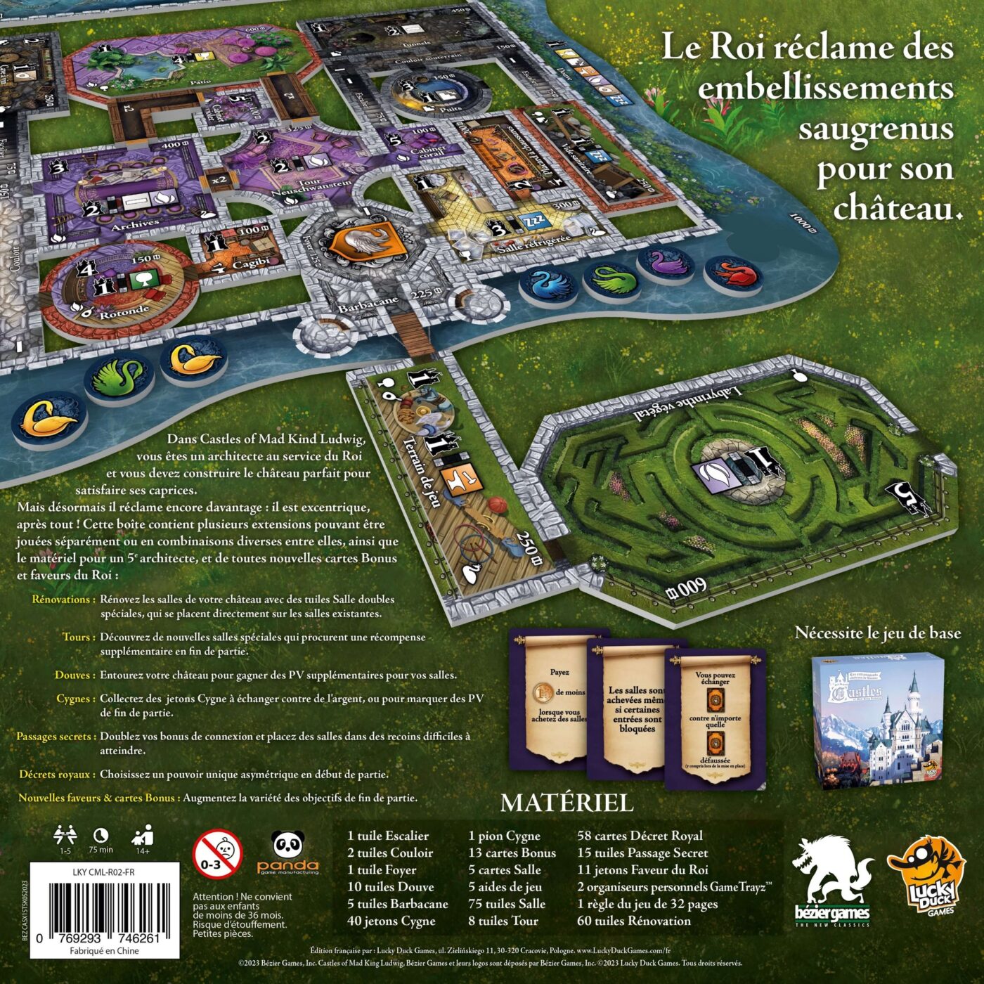 Construisez un château encore plus dingue avec les nouveautés apportées par les extensions de Castles of Mad King Ludwig ! Transformez vos parties en jouant les extensions séparément ou en combinaison. Invitez un 5e architecte à la table, et changez vos habitudes de construction avec de toutes nouvelles cartes Bonus et Faveur du Roi.