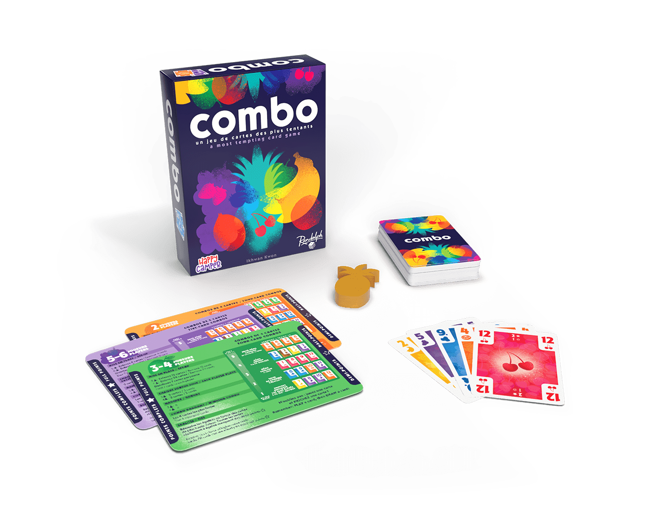 COMBO est un jeu de cartes tactique et plein d’interactions où vous tentez de créer la combinaison de fruits la plus savoureuse… et la plus payante! À chaque tour, les joueurs posent une carte face visible pour construire ensemble une combinaison commune. Mais attention : rien ne garantit que votre carte fera partie de la sélection finale! Il faudra parfois ruser, bluffer ou convaincre les autres de vous suivre pour maximiser vos chances de marquer des points. Les cartes de faible valeur rapportent gros, mais sont plus facilement écartées. À la fin de chaque manche, seuls les joueurs ayant placé les bonnes cartes récoltent des points. Après plusieurs manches, celui qui a su tirer son épingle du jeu et cumuler le plus de points remporte la partie!