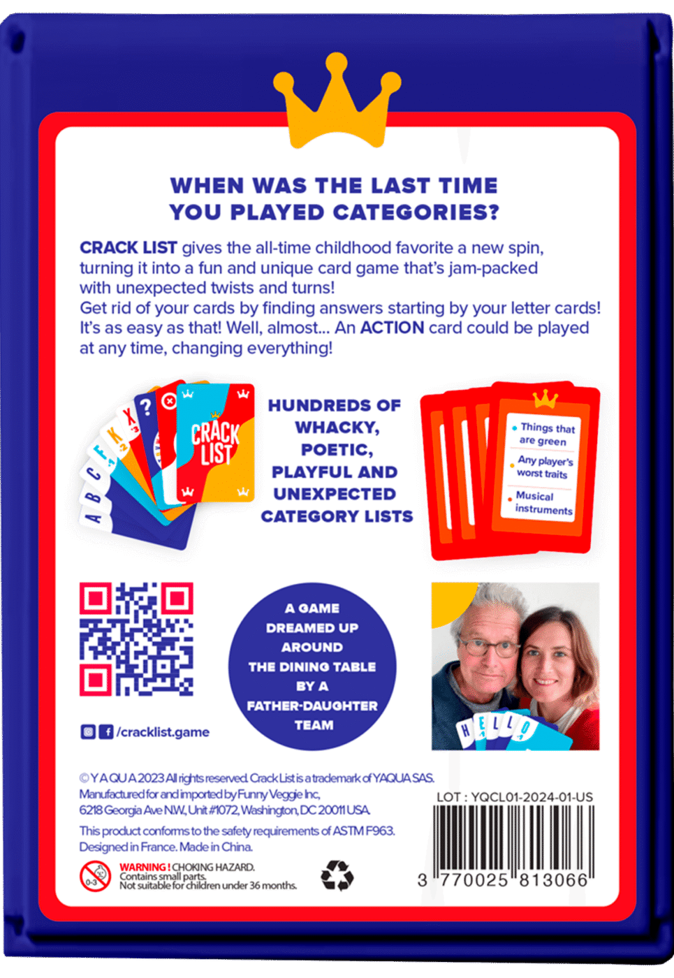 Deal 8 cards by player, play turn by turn, get rid of your cards by giving answers that start by your letter cards! Think it sounds easy? Think again!, Each time a new CRACK LIST card is played, a brand-new category, gets chosen…And whenever an ACTION card is played, the whole game can get turned on its head...