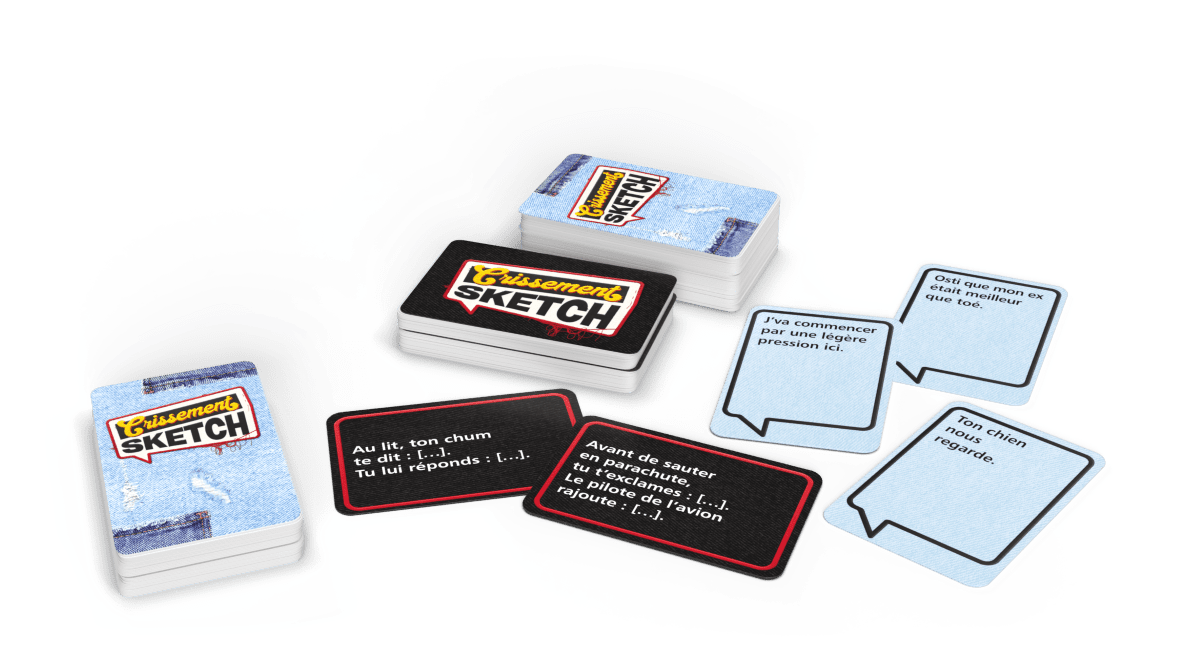 Dans ce jeu crissement sketch, les cartes bleues sont des choses que disent les gens. Les cartes noires, des situations de vie. Mélange les deux pis tu vas avoir des affaires comme :