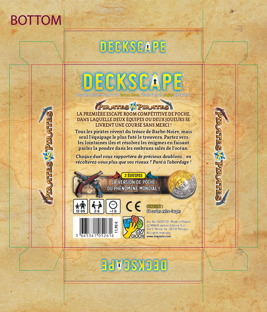 LA PREMIÈRE ESCAPE ROOM COMPÉTITIVE DE POCHE, DANS LAQUELLE DEUX ÉQUIPES OU DEUX JOUEURS SE LIVRENT UNE COURSE SANS MERCI ! Tous les pirates rêvent du trésor de Barbe-Noire, Mais seul l’équipage le plus futé le trouvera. Partez vers les lointaines îles et résolvez les énigmes en faisant parler la poudre dans les embruns salés de l’océan.