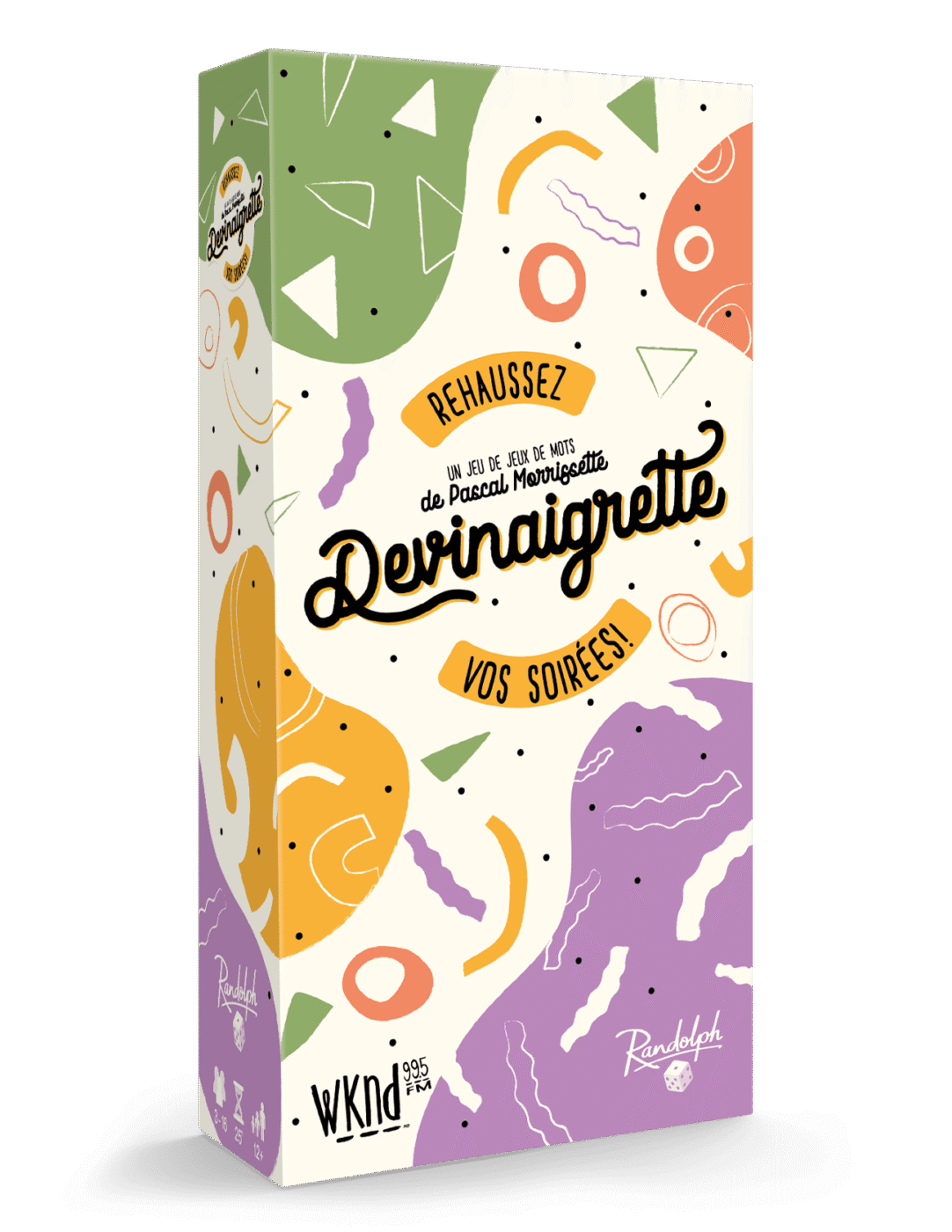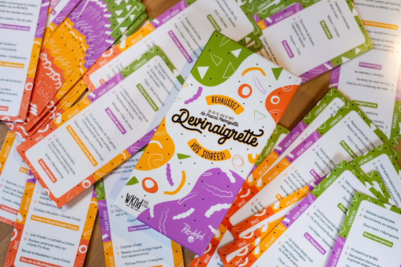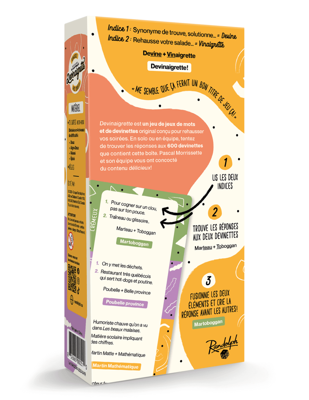 Devinaigrette est un jeu de jeux de mots et de devinettes original conçu pour rehausser vos soirées. En solo ou en équipe, tentez de trouver les réponses aux 600 devinettes que contient cette boîte. Pascal Morrissette et son équipe vous ont concocté du contenu délicieux !