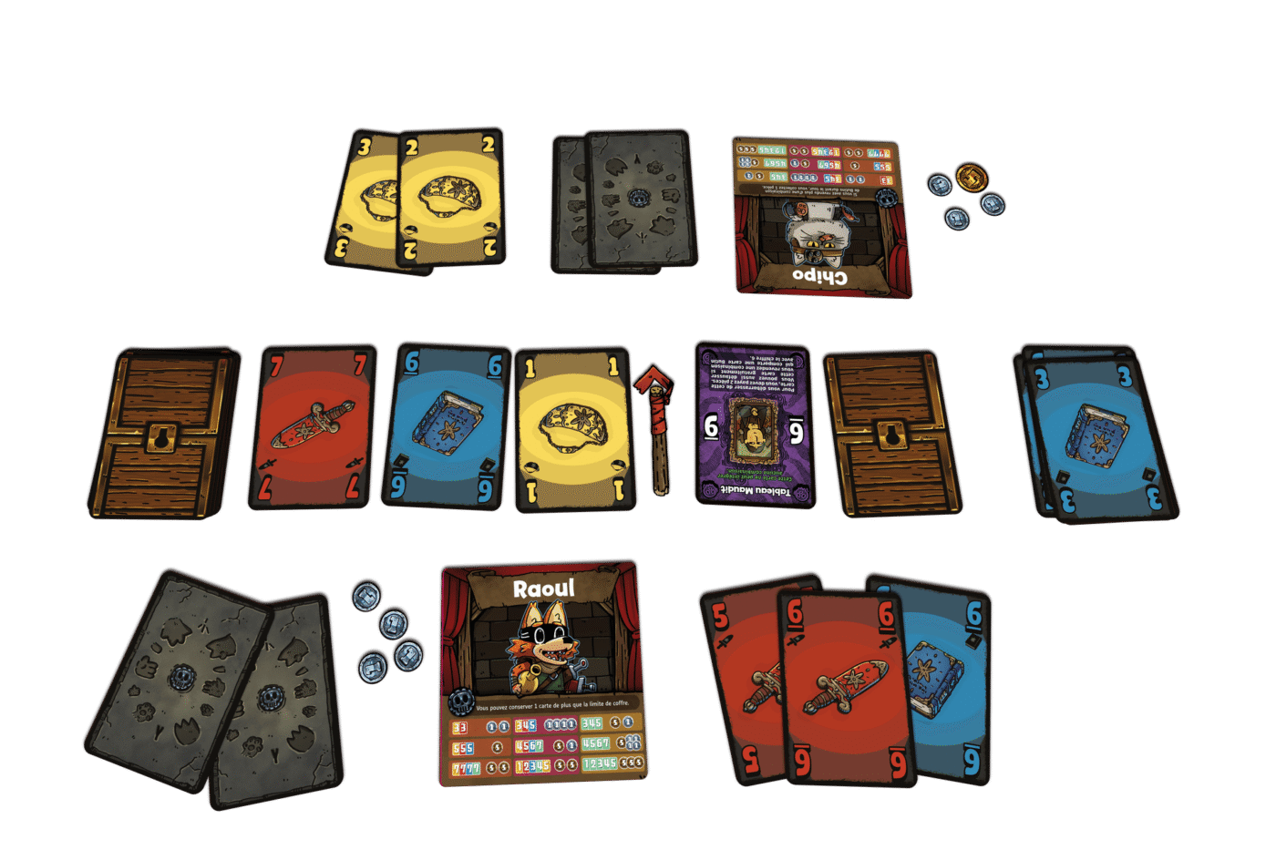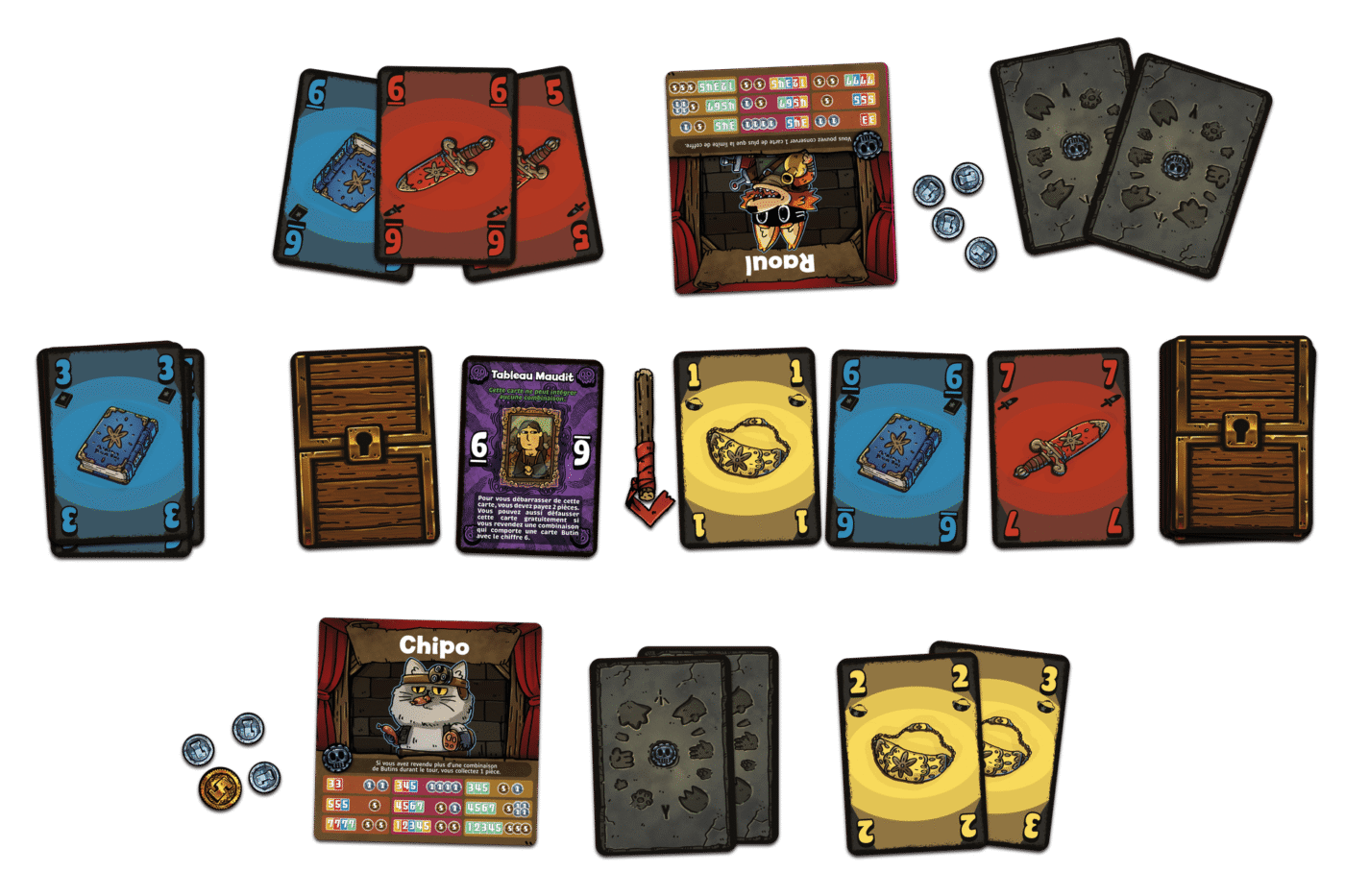 Dans Duel d’Escrocs, deux brigands s’affrontent pour mettre la main sur le plus gros morceau du butin. Chaque tour est un face-à-face où bluff, intuition et pièges subtils rythment la partie. Proposez un partage… ou refusez celui de l’autre pour tenter d’empocher de meilleurs trésors. Mais attention : un mauvais calcul, et c’est vous qui repartirez les poches vides !