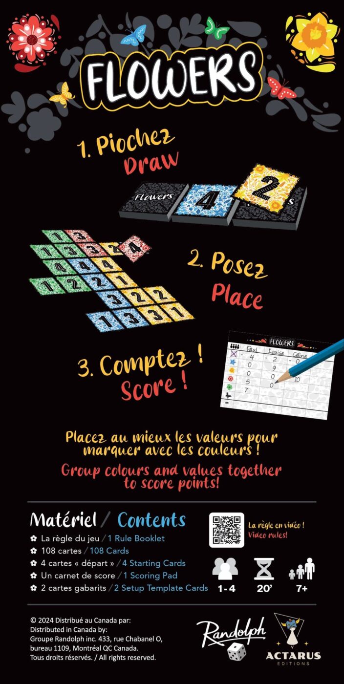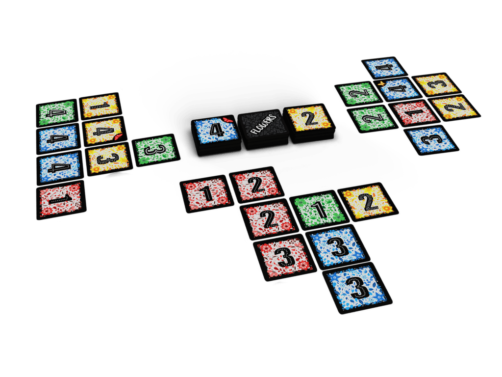 Dans Flowers, chaque joueur compose un jardin de cartes en tentant de former de belles zones colorées pour marquer un maximum de points. Mais attention : pour qu’une zone rapporte, elle doit respecter certaines règles de regroupement… sinon, c’est la dégringolade !