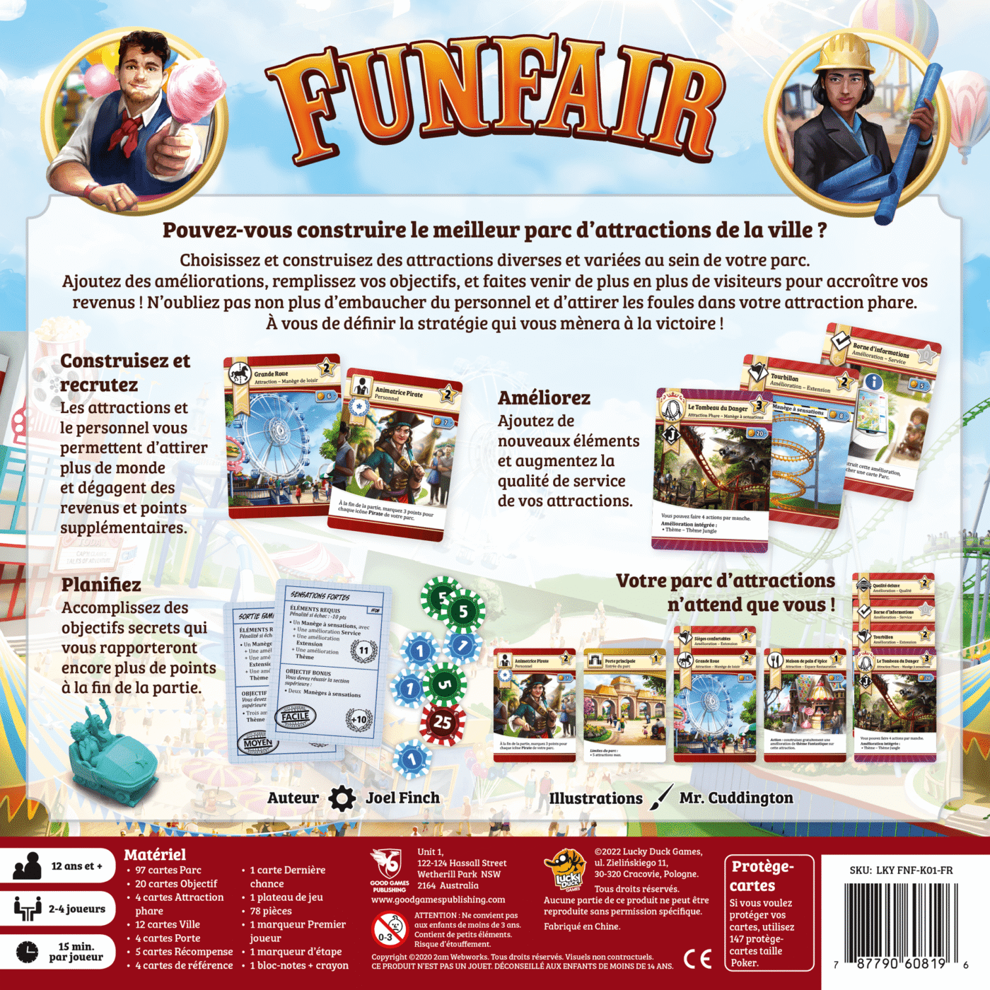 Améliorez vos attractions pour qu’elles correspondent aux plans ou simplement pour ériger des manèges imposants qui attirent les foules et rapportent le plus d’argent. Embauchez des membres du personnel et construisez de super attractions pour maximiser la stratégie de votre parc en vue de la victoire! Avec une configuration et un gameplay rapides, Funfair est un jeu amusant et familial. Des objectifs faciles à complexes, de nombreuses cartes offrent de nombreux plans de jeu aux joueurs qu’ils soient novices ou expérimentés.