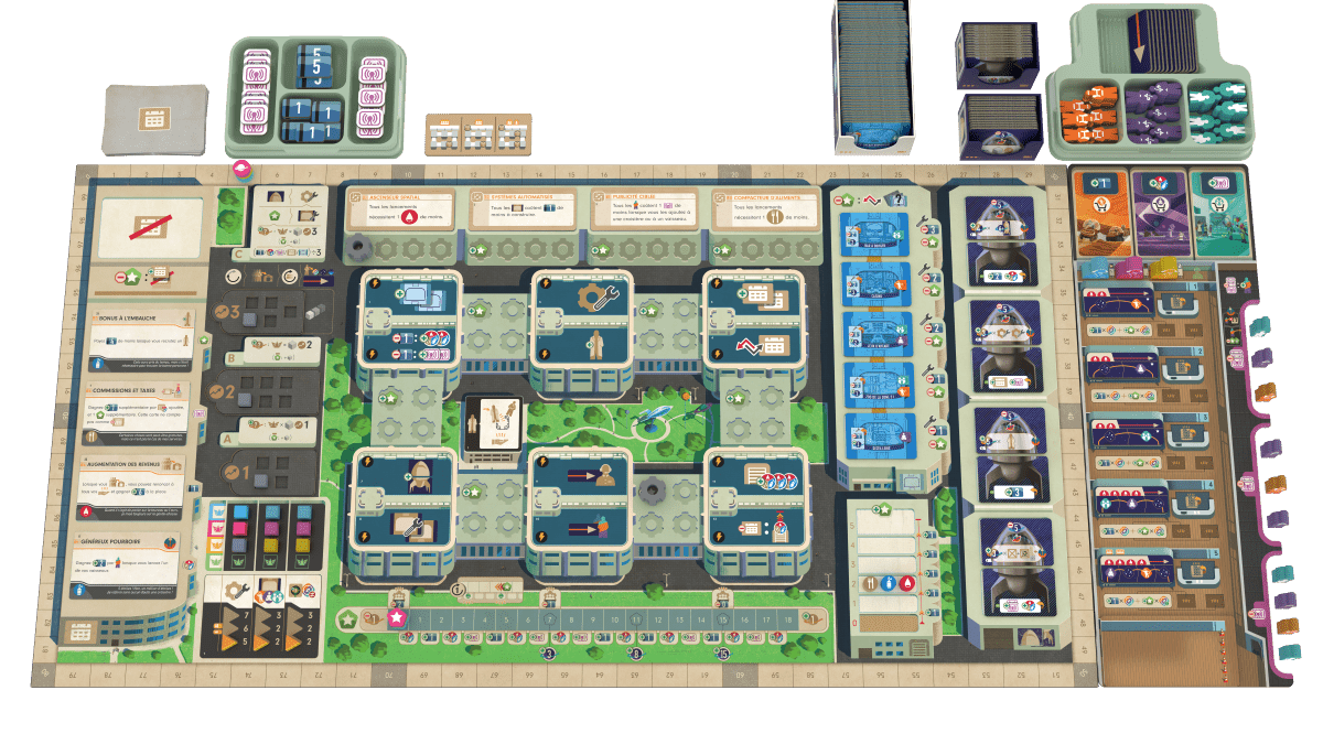À votre tour, vous pouvez soit placer un travailleur pour effectuer deux actions dans le réseau en constante expansion, soit lancer un vaisseau et envoyer l'un de vos travailleurs dans l'espace en tant que pilote, soit rappeler tous vos travailleurs terrestres pour collecter des bonus de financement. Les actions comprennent l'acquisition de plans, la construction de vaisseaux, l'attraction d'invités et la construction de développements - des connexions entre les lieux qui augmentent le choix des actions tout au long du jeu.