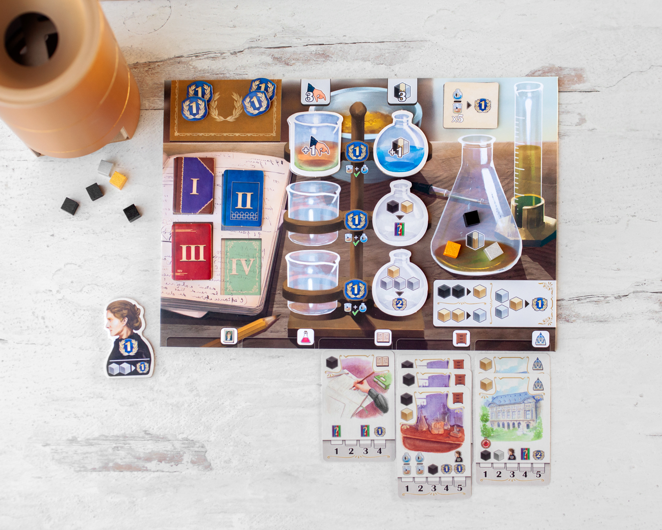Rest: this is the end of your turn! Check the number of resources in your Erlenmeyer flask and move the Workshop marker to the next square. Over the course of the game, you’ll follow the major events in Marie Curie’s life through a timeline. Once you’ve reached the end of the timeline, the player with the most points wins the game!