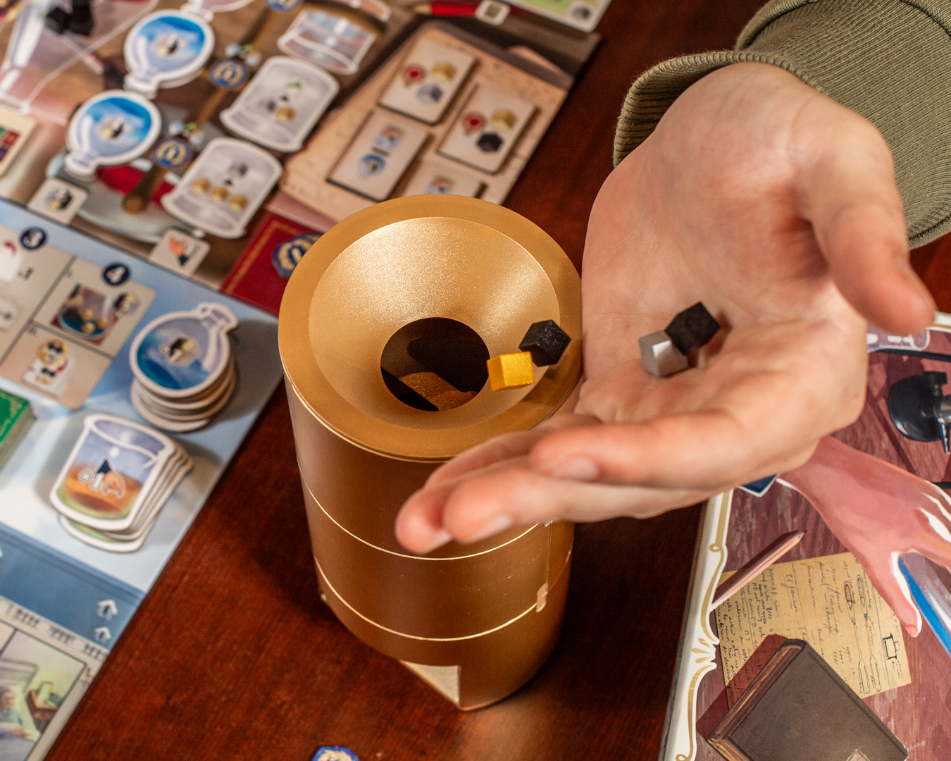 Use the Workshop machine: here, you take the cubes indicated on the Workshop tile from the reserve and throw them into the cube tower. Those that fall to the bottom of the tower are available for your research!