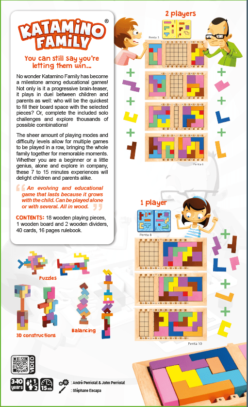 No wonder Katamino Family has become a milestone among educational games! Not only is it a progressive brain-teaser, it plays in duel between children and parents as well. Who will become the quickest to fill their board space with the selected pieces? Or complete the included solo challenges and explore thousands of possible combinations!