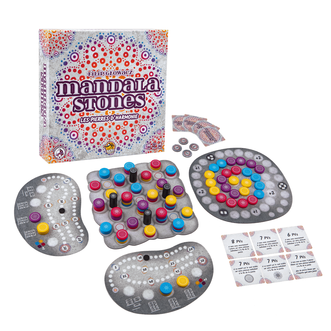 Pour mettre en place le jeu, placez aléatoirement les 96 pierres (24 dans chacune des quatre couleurs et 48 dans chacun des deux dessins) sur le plateau principal, par pile de 4. Placez les 4 piliers Artiste à leur position de départ au coeur de ces piles de pierres.