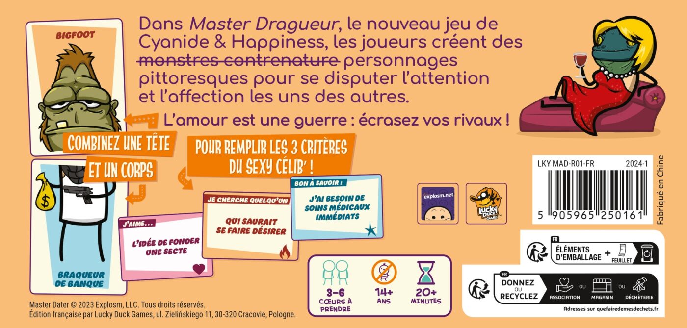 Dans Master Dragueur, chaque joueur incarne tour à tour un célibataire « sexy » aux goûts vraiment particuliers. Les autres doivent alors créer le pire rendez-vous possible en combinant des cartes Tête et Corps… tout en essayant de séduire le célibataire avec ses intérêts improbables. Qui saura bâtir le date le plus catastrophique… mais parfaitement irrésistible ?
