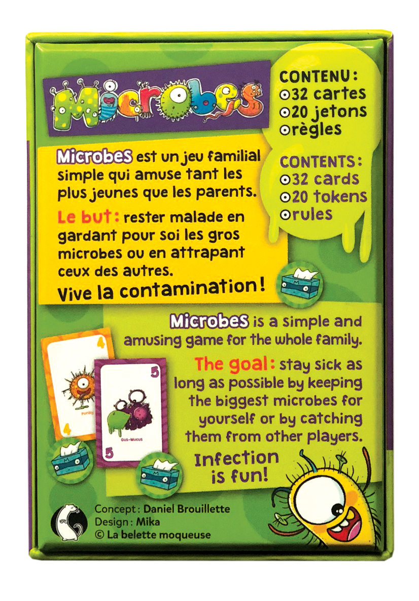 Simple, rapide et rempli de rires, Microbes amuse autant les enfants que les parents. Le but ? Garder pour toi les gros microbes ou attraper ceux des autres pour rester le plus contaminé possible. Oui, oui : ici, la contamination, c’est la clé de la victoire !