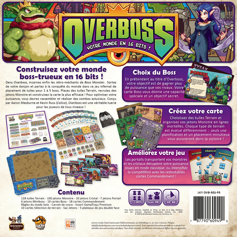 Dans Overboss, des Boss rivaux sortent de leurs donjons pour conquérir l’Overworld. À chaque tour, les joueurs draftent et placent des tuiles de terrain et des jetons de monstre. Leur objectif : créer la carte avec la plus grande puissance et devenir l’Overboss ultime !