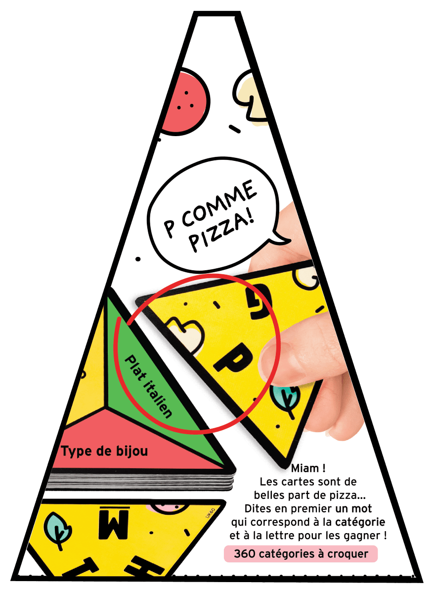 À chaque tour, une lettre et trois catégories apparaissent : facile, moyen ou difficile. Le premier qui trouve un mot qui commence par la bonne lettre et qui correspond à une des catégories remporte la carte… et construit sa méga-part de pizza.