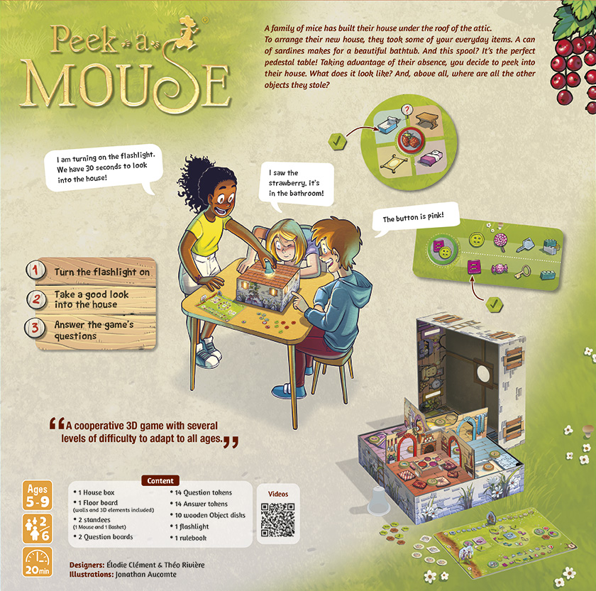 Together in Peek-a-Mouse, the players observe the different rooms of the house through the windows before the flashlight goes out. Then they need to work together to remember the location and direction of the tokens to find as many objects as possible before the little mice return!