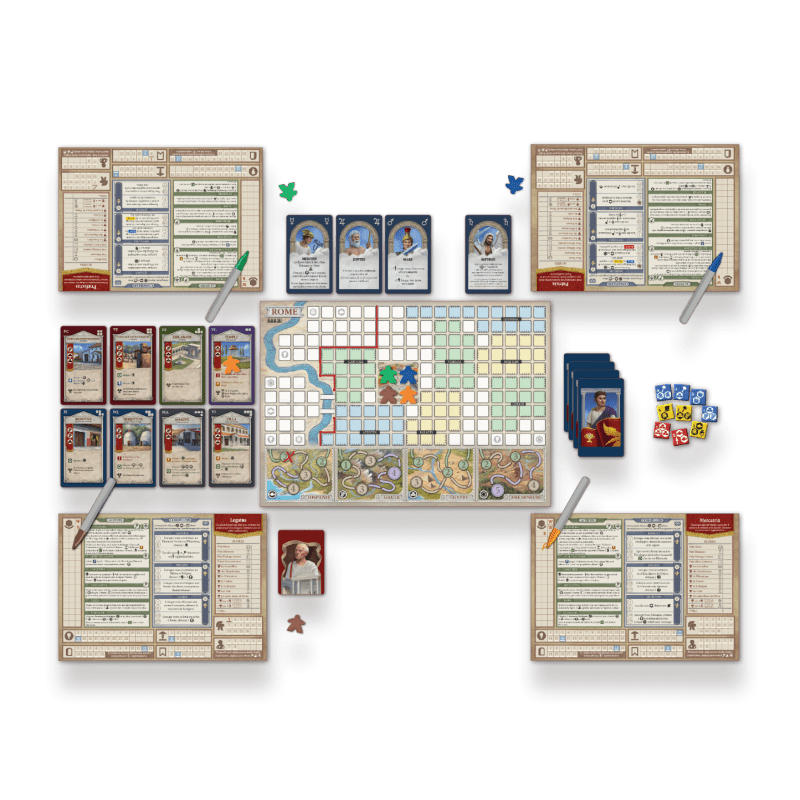 Rome & Roll est un jeu stratégique de type “roll & write” dans lequel vous incarnez un personnage influent, du négociant au chef militaire en passant par le haut fonctionnaire. Tous asymétriques, ces personnages offrent de nombreuses possibilités de stratégies pour prendre l’avantage sur vos adversaires.