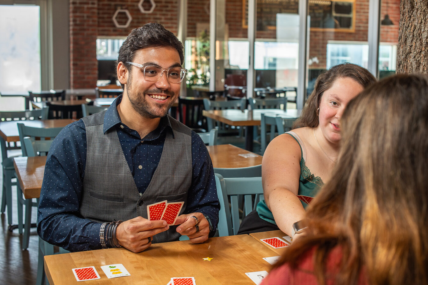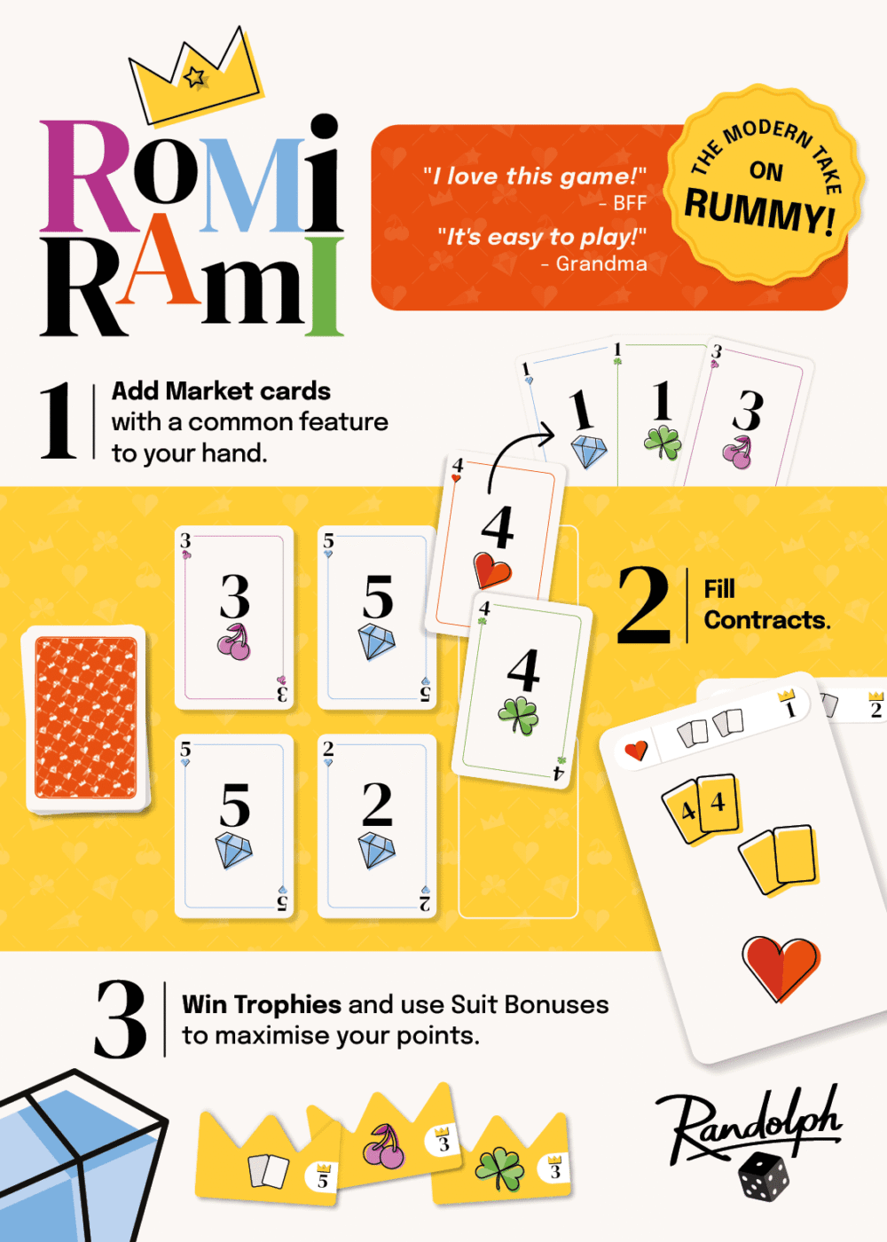 Falling squarely in the family of ‘Rummy’ games, Romi Rami features a double market. The first one has number cards, and the second one has contracts to complete.