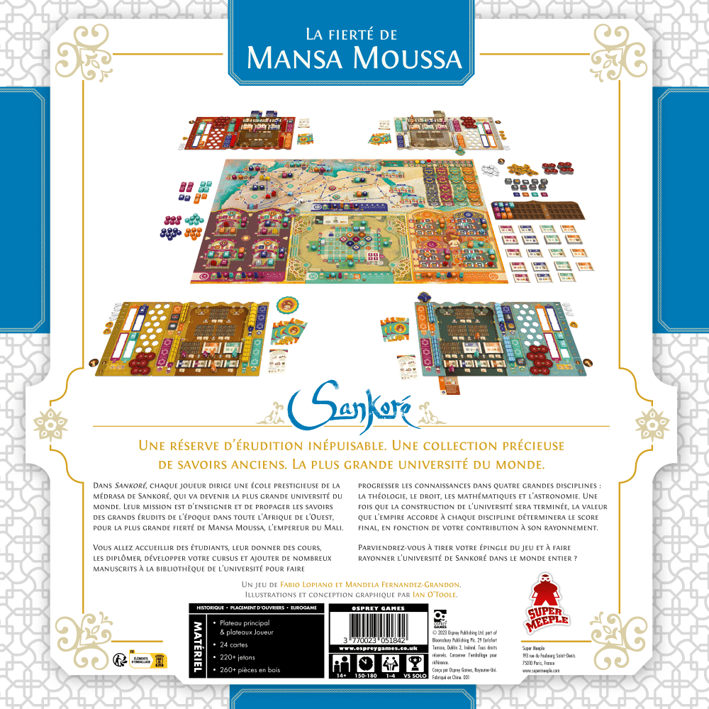 Dans Sankoré, chaque joueur dirige une école prestigieuse de la Médrasa de Sankoré, qui va devenir la plus grande université du monde. Leur mission est d’enseigner et de propager les savoirs des grands érudits de l’époque dans toute l’Afrique de l’Ouest, pour la plus grande fierté de Mansa Moussa, l’Empereur du Mali. Vous allez accueillir des étudiants, leur donner des cours, les diplômer, développer votre cursus et ajouter de nombreux manuscrits à la bibliothèque de l’université pour faire progresser les connaissances dans quatre grandes disciplines : la théologie, le droit, les mathématiques et l’astronomie. Une fois que la construction de l’université sera terminée, la valeur que l’empire accorde à chaque discipline déterminera le score final en fonction de votre contribution à son rayonnement.