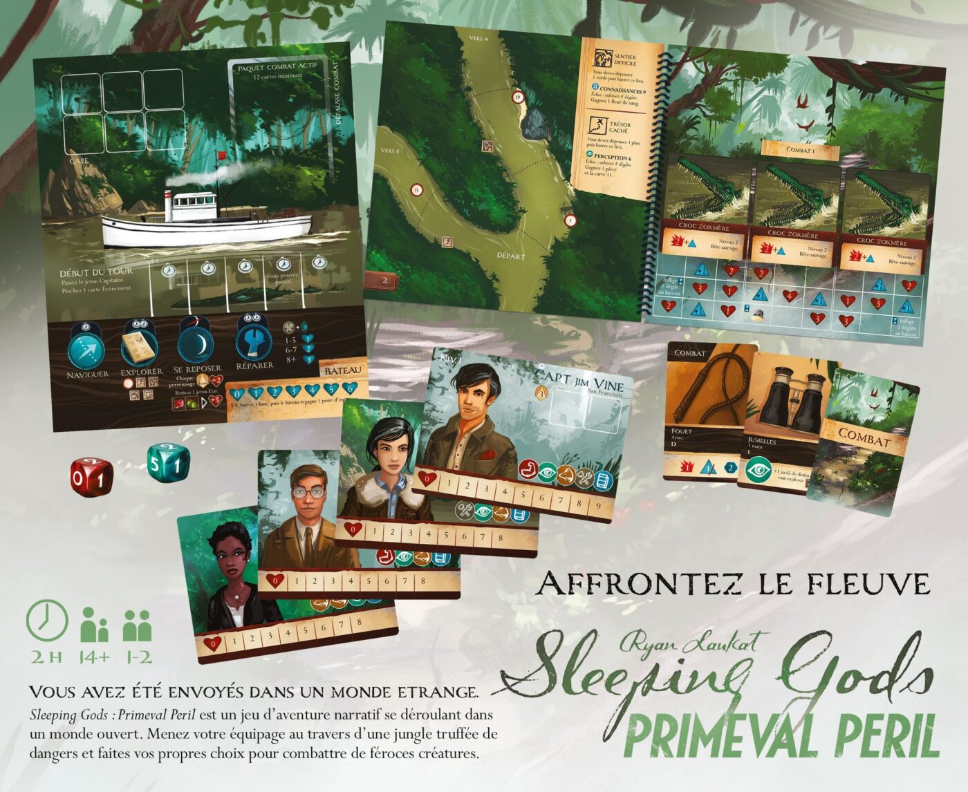 Sleeping Gods : Primeval Peril est une courte campagne autonome pour un ou deux joueurs, mais elle comprendra une variante pour jouer à 3-4, se déroulant dans le monde de Sleeping Gods et utilisant les mêmes règles.