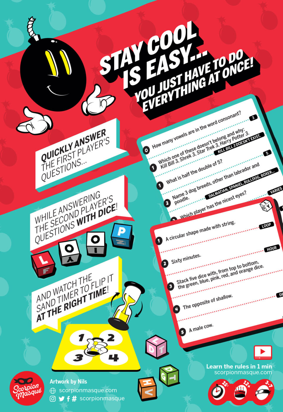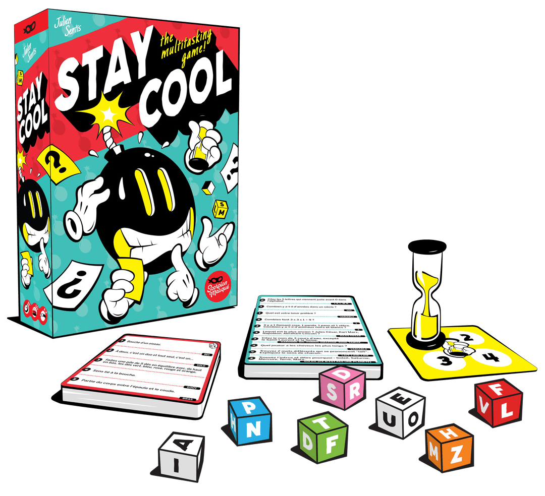 In Stay Cool, you must answer one player’s questions out loud, while writing answers to another player’s questions using dice… all while keeping an eye on the sand timer so you can flip it at the right moment. Simple? Yes. Until everything happens at once!