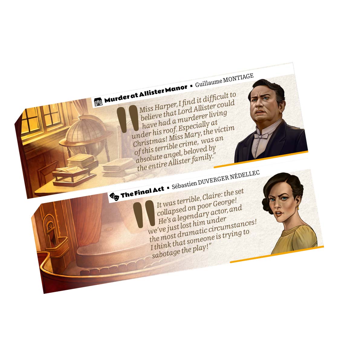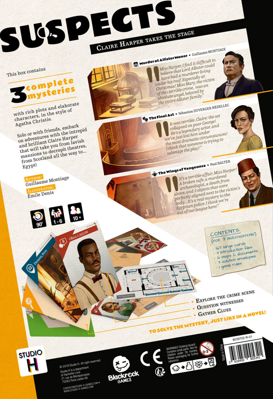 Suspects is a range of investigation games with streamlined rules and plots centered on the psychology of the characters in the style of Agatha Christie’s novels. The first opus will feature the ingenious and fearless Claire Harper in three stories that pay tribute to the great classics of detective literature!
