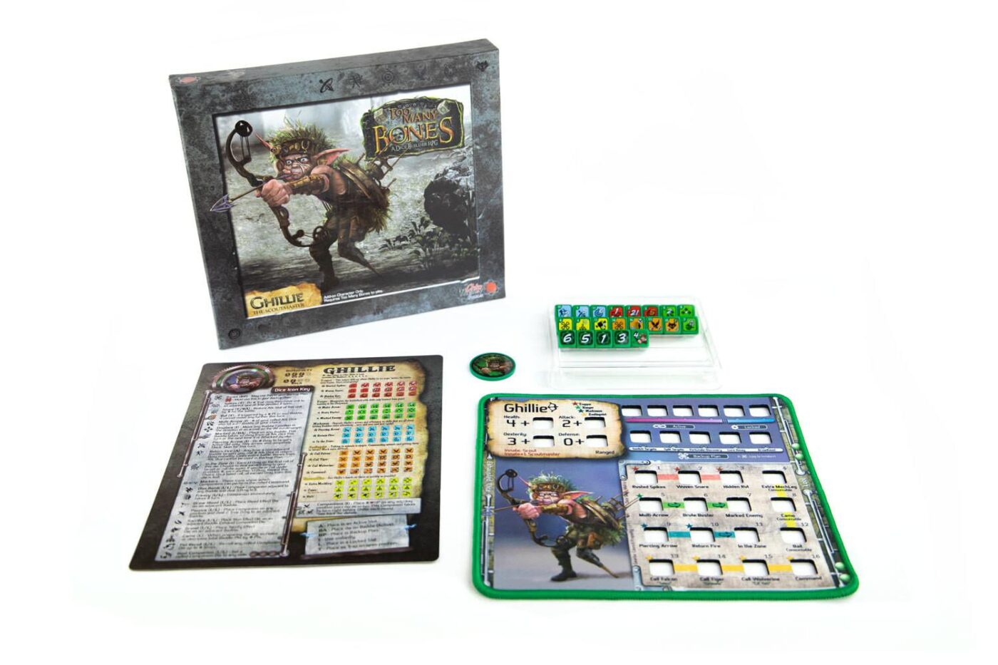 Ghillie est livré avec son propre set de 21 magnifiques dés personnalisés, un jeton de personnage, un porte-dés refermable et un tapis de personnage en néoprène cousu sur les bords.