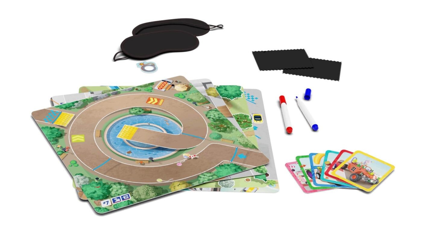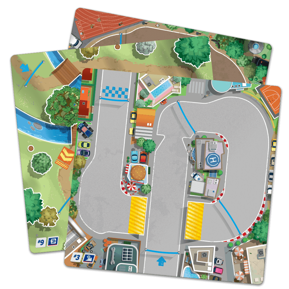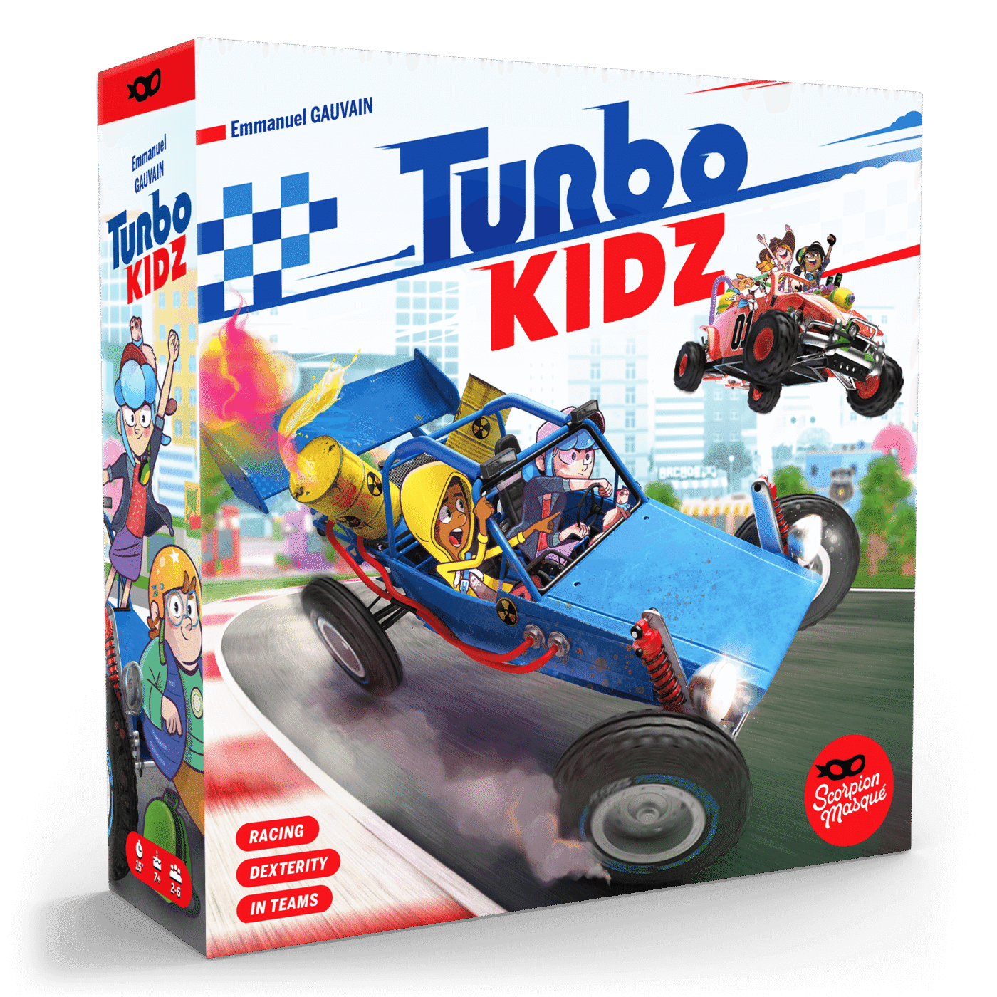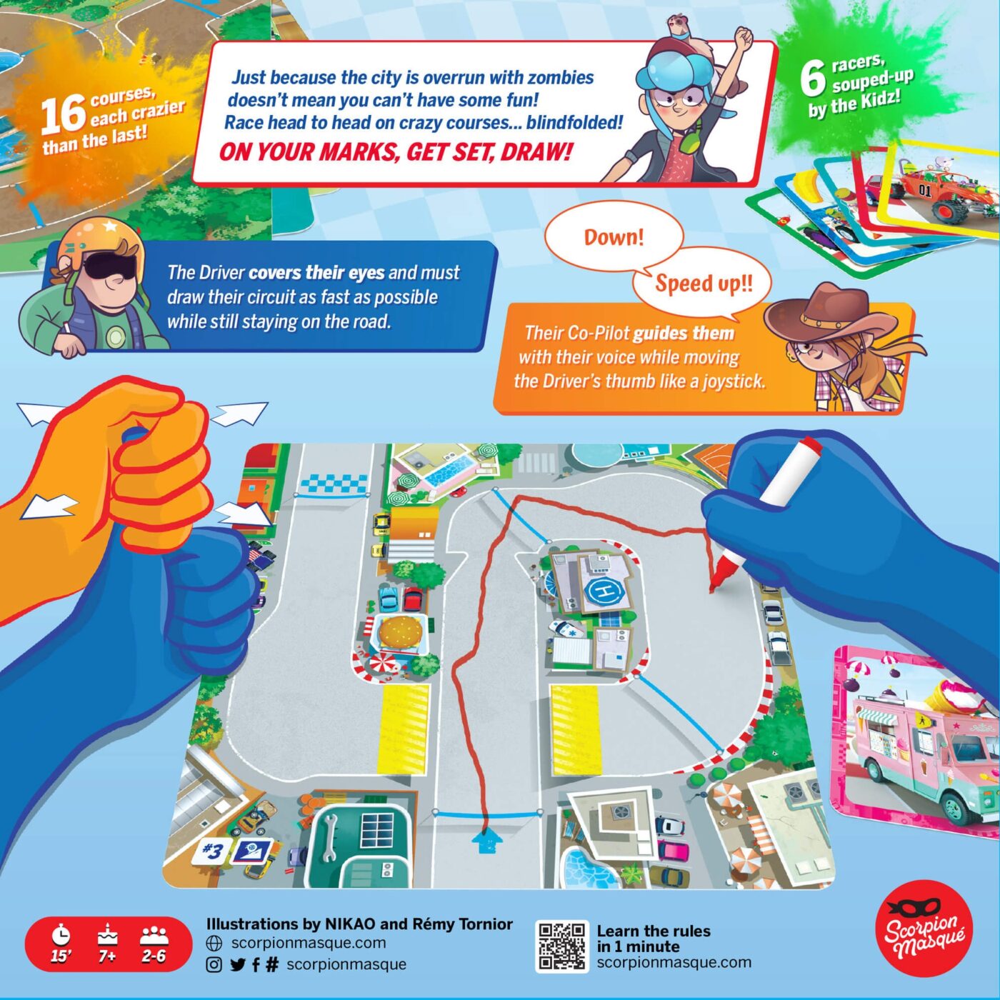Either cooperatively or competitively, be the first to cross the finish line in a series of hilarious races. In Turbo Kidz, the Driver covers their eyes and must draw their circuit as fast as possible while still staying on the road. Their Co-Pilot guides them with their voice while moving the Driver’s thumb like a joystick and preventing you from going off the road! Tear up the course on 16 unique circuits, keep ahead of the pack with turbo boosts, and customize your car with gadgets to send your opponents spinning into the ditch while you zoom off to victory! Thrills and spills guaranteed!