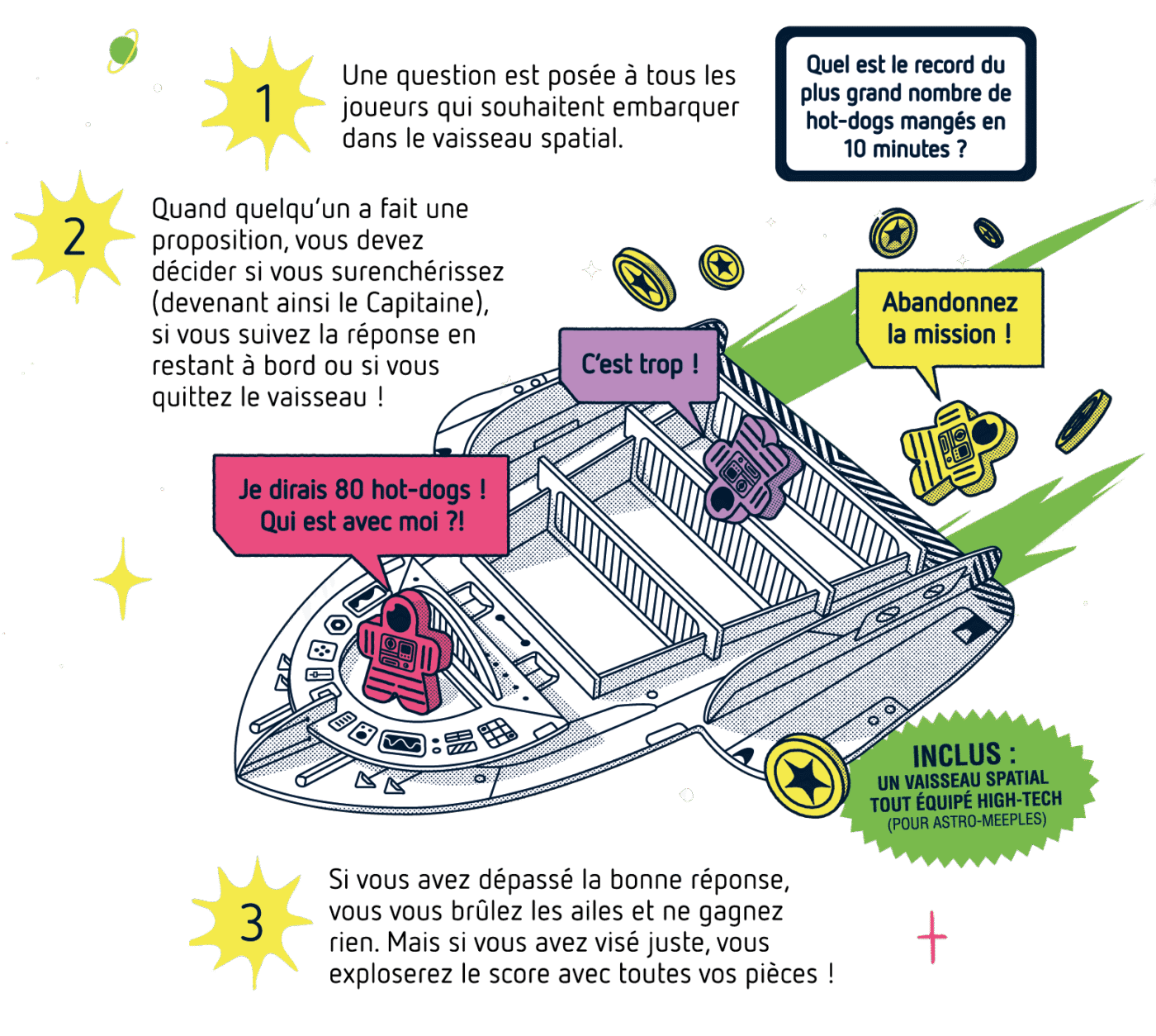 2- Quand quelqu'un a fait une proposition, vous devez décider si vous surenchérissez, (devenant ainsi Capitaine) si vous suivez la réponse en restant à bord ou si vous quittez le vaisseau!