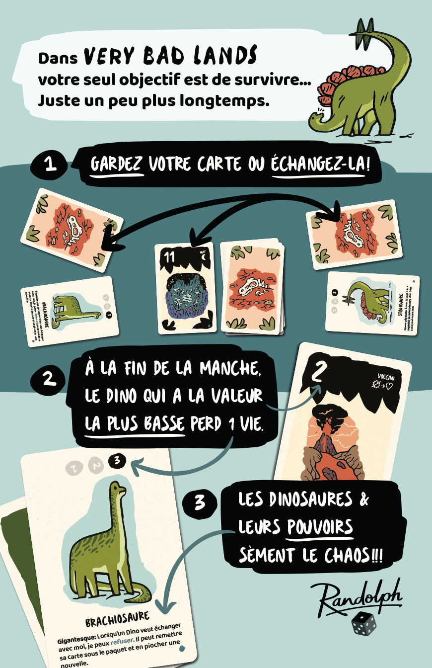 Utilisez le pouvoir de votre Dinosaure au bon moment pour survivre... juste un peu plus longtemps que l’un de vos adversaires. Chacun de vos tours consiste en une décision simple, mais cruciale : Gardez votre carte ou échangez-la, soit avec votre voisin de gauche ou avec la carte visible du centre.
