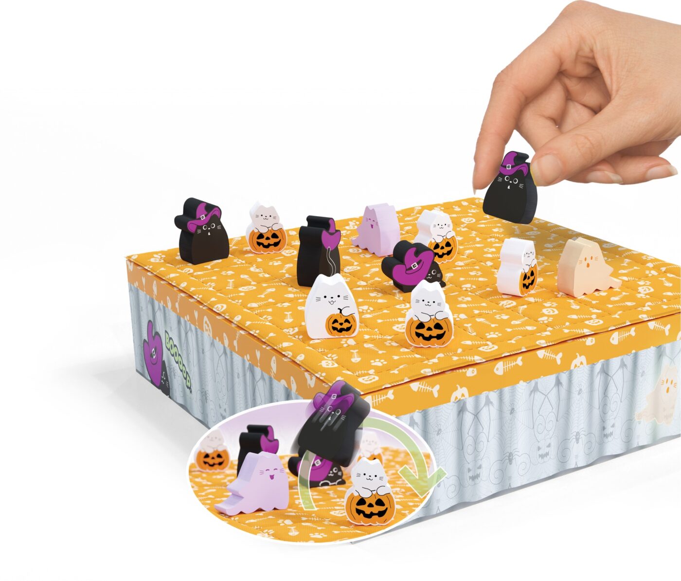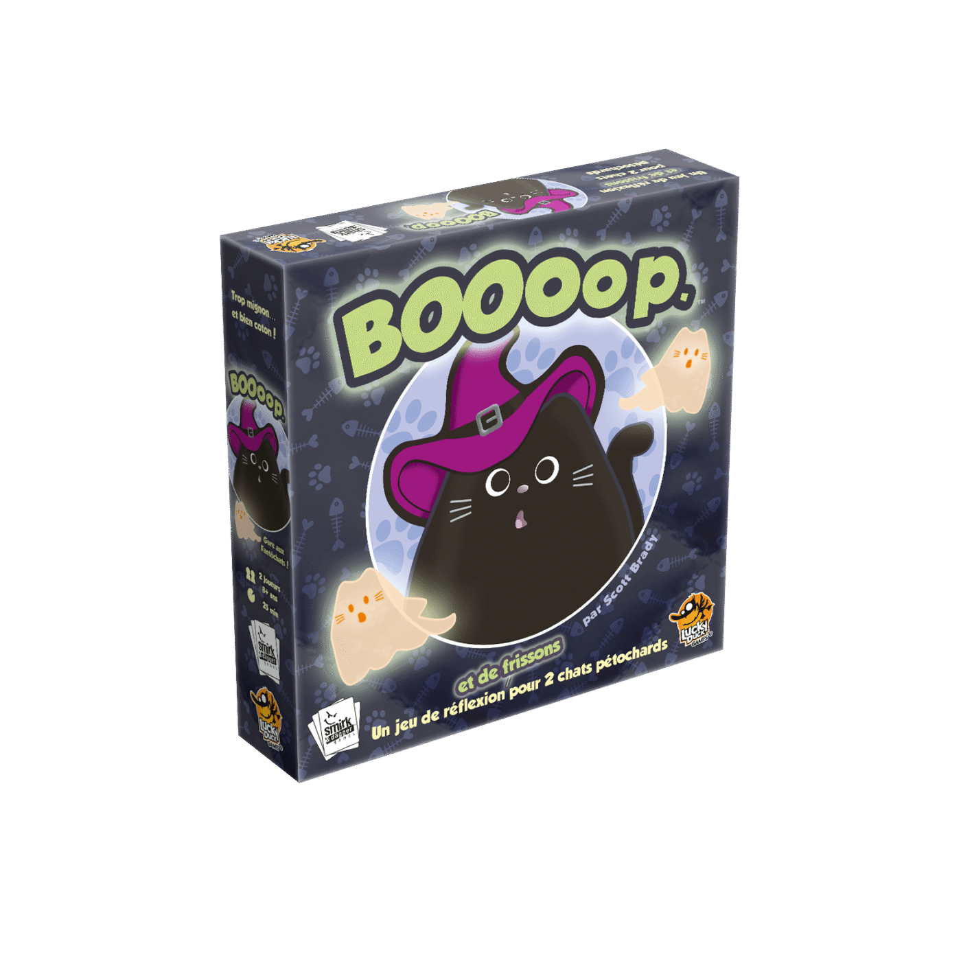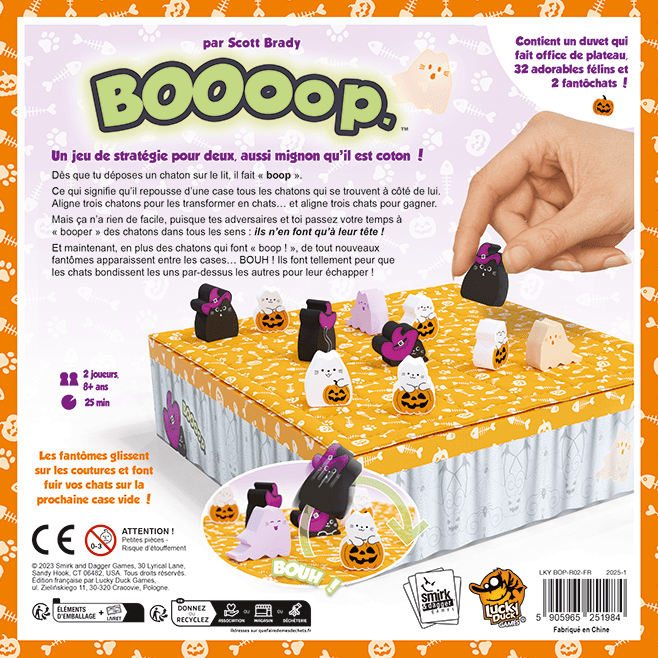 BOOooop reprend la formule adorée de boop et y ajoute une dose de mystère et de fantômes ! Placez vos chatons sur le lit : chaque pose provoque un “boop” qui repousse les chatons adjacents d’une case. Alignez-en trois pour les faire évoluer en chats… puis alignez trois chats pour gagner la partie.