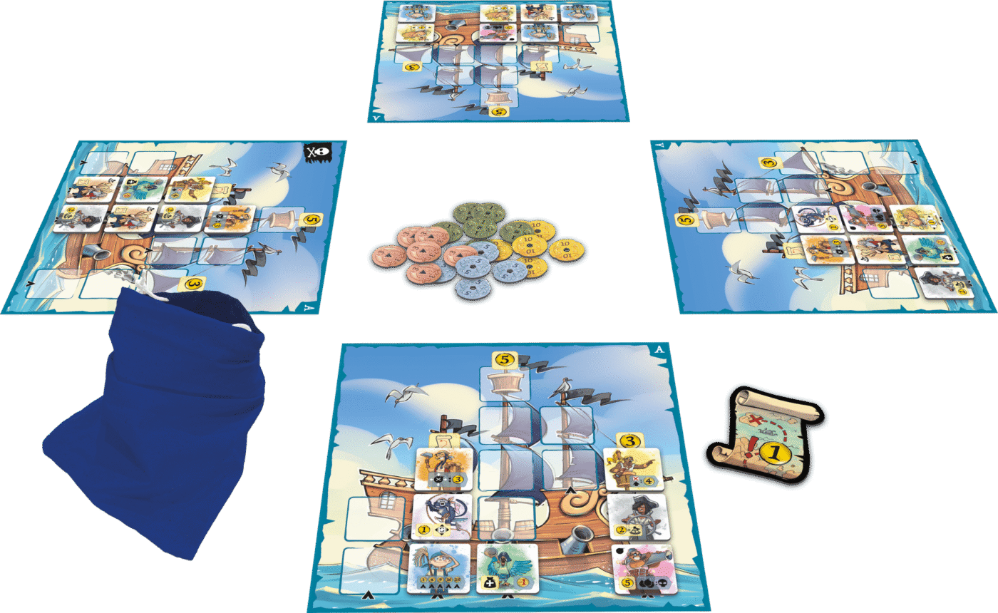 The players are pirate captains that recrute a team to vogue and accumulate gold. The player having the most coins at the end of the game will be victorious.