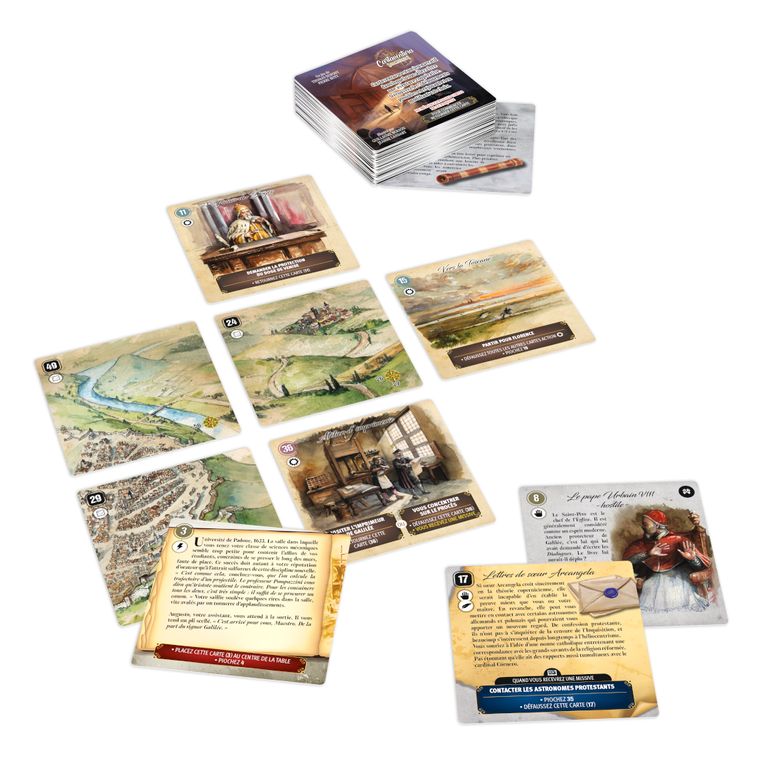 Entrez dans l'univers révolutionnaire de Cartaventura, une gamme de jeux narratifs qui redéfinit l'expérience ludique. Dans ces jeux uniques, les joueurs prennent activement part à leur aventure, où chaque décision devient cruciale. À l’aide de cartes, vous façonnerez le déroulement de l’histoire, avec des choix qui influenceront le cours de l’intrigue et les destinées des personnages. Chaque partie est une immersion totale dans un récit dynamique, où vos actions et leurs conséquences façonnent l’évolution du jeu. Laissez-vous emporter par l'aventure et devenez l'acteur principal de votre propre histoire ! COSMOLOGIA vous plonge en 1633, à Padoue, en Italie, au cœur d'une époque où la science est en pleine révolution et où les croyances religieuses entrent en conflit avec les découvertes scientifiques. En tant que disciple de Galilée, l'un des plus grands scientifiques de son époque, vous vous retrouvez pris dans une course contre la montre pour sauver votre maître, qui est sur le point d'être jugé à Rome pour hérésie. L'Inquisition, furieuse après la publication de son traité révolutionnaire sur l'astronomie, menace de le condamner. Votre mission ? Rassembler des preuves, convaincre les acteurs du procès et influencer le jugement, tout en naviguant dans un terrain semé d’embûches, où la vérité scientifique doit affronter des forces politiques et religieuses implacables. Saurez-vous collecter suffisamment d'éléments pour convaincre l'Inquisition de reconsidérer sa position et sauver le futur de la science ?