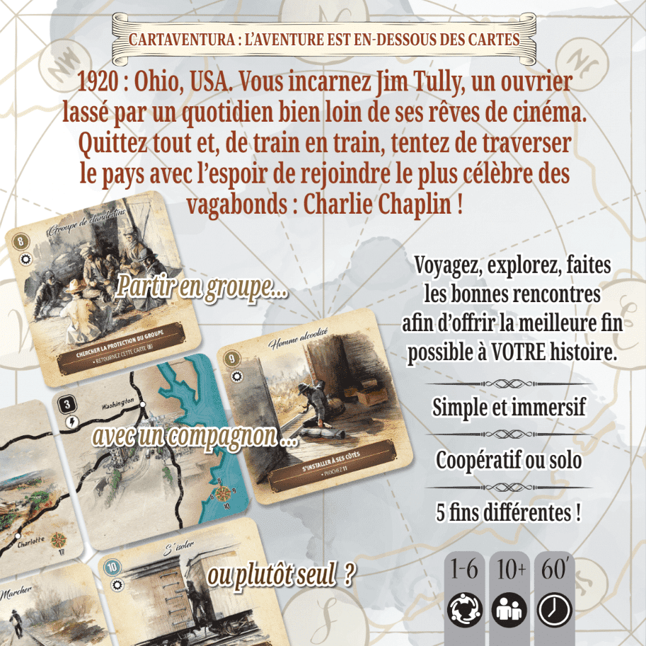 1920 : Ohio, USA. Vous incarnez Jim Tully, un ouvrier lassé par un quotidien bien loin de ses rêves de cinéma. Quittez tout et, de train en train, tentez de traverser le pays avec l’espoir de rejoindre le plus célèbre des vagabonds : Charlie Chaplin !