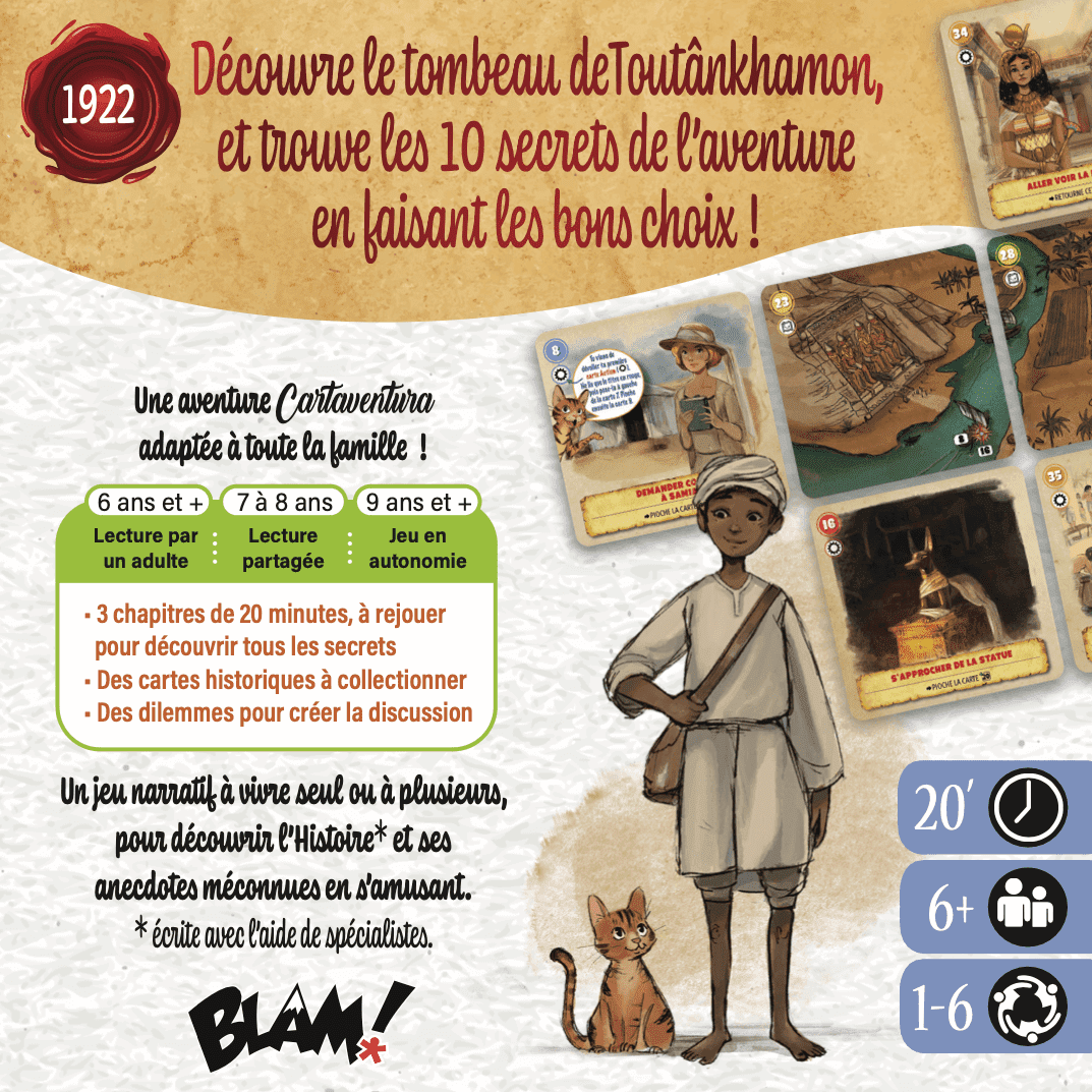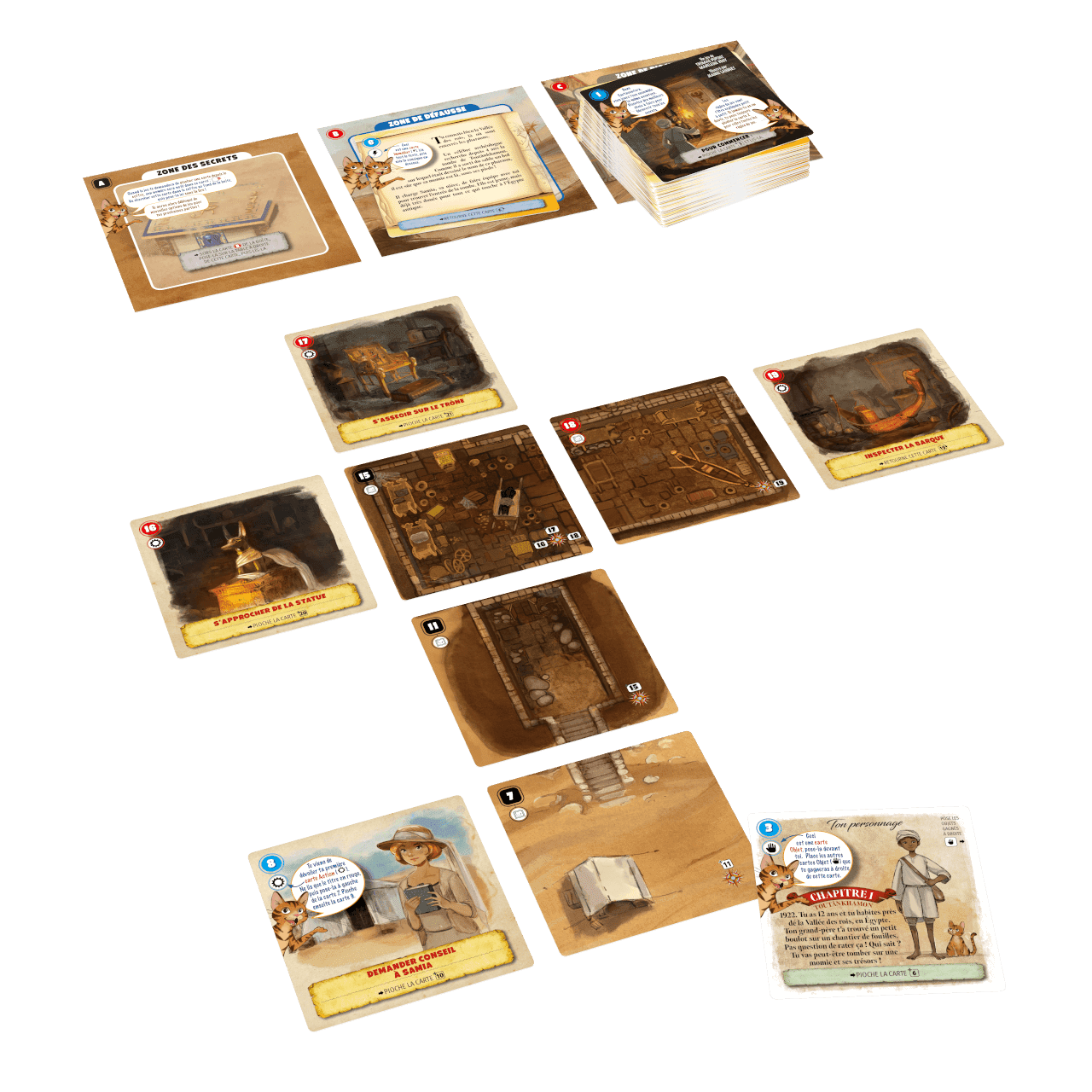 Chaque scénario de Cartaventura Odyssée se compose de trois chapitres d'environ vingt minutes chacun. Au fil de vos parties, vous dévoilerez des cartes secrètes qui débloqueront de nouvelles parties de l'histoire. En rejouant l'aventure, vous pourrez ainsi découvrir toutes les fins possibles. Pendant votre périple, vous débloquerez également les 10 cartes Savoir qui vous permettront d'apprendre l'histoire de l'Égypte antique tout en vous amusant.