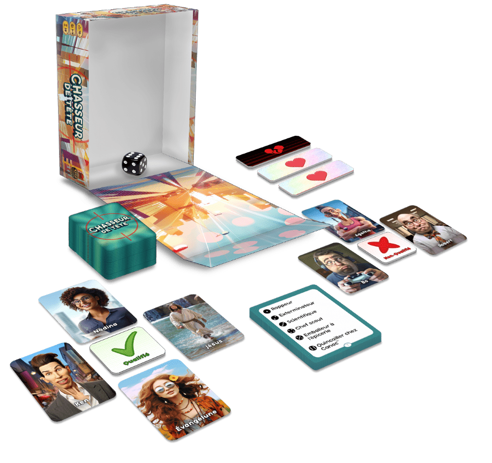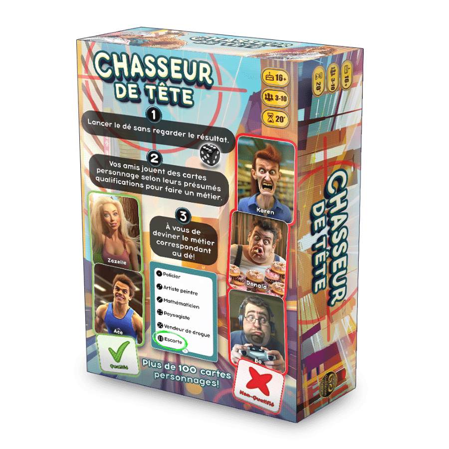 De façon coopérative, faites découvrir des métiers à vos amis en utilisant des cartes Personnages. Tenter de faire une bonne lecture des indices pour deviner 7 métiers et gagner la partie!