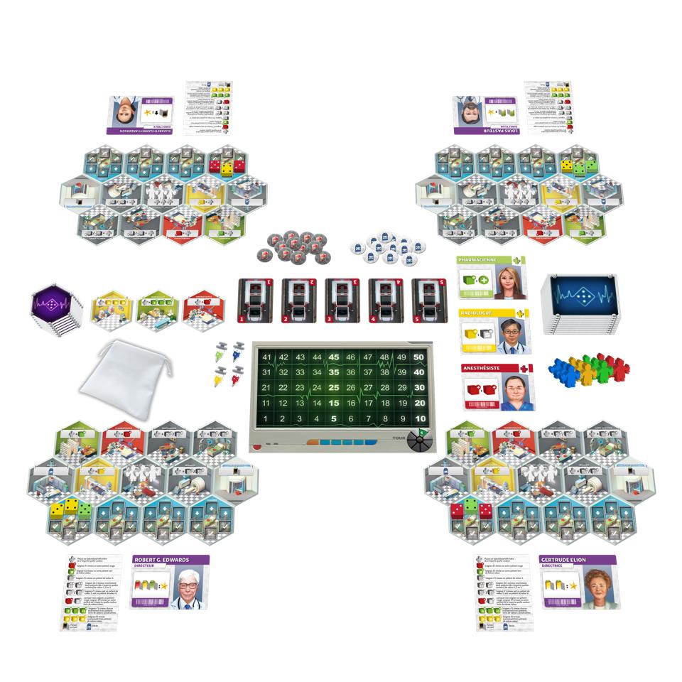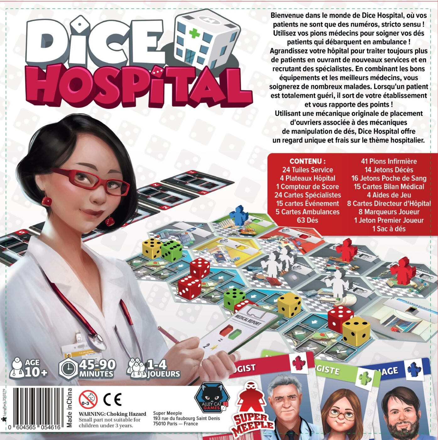 Bienvenue dans votre Hôpital, où vos patients sont des dés ! Utilisez vos pions médecins pour soigner les patients qui débarquent en ambulance ! Agrandissez votre hôpital pour en traiter toujours plus en ouvrant de nouveaux services et en recrutant des spécialistes. En combinant les bons équipements et les meilleurs médecins, vous soignerez de nombreux malades. Lorsqu’un patient est guéri, il sort de votre établissement et vous rapporte des points.