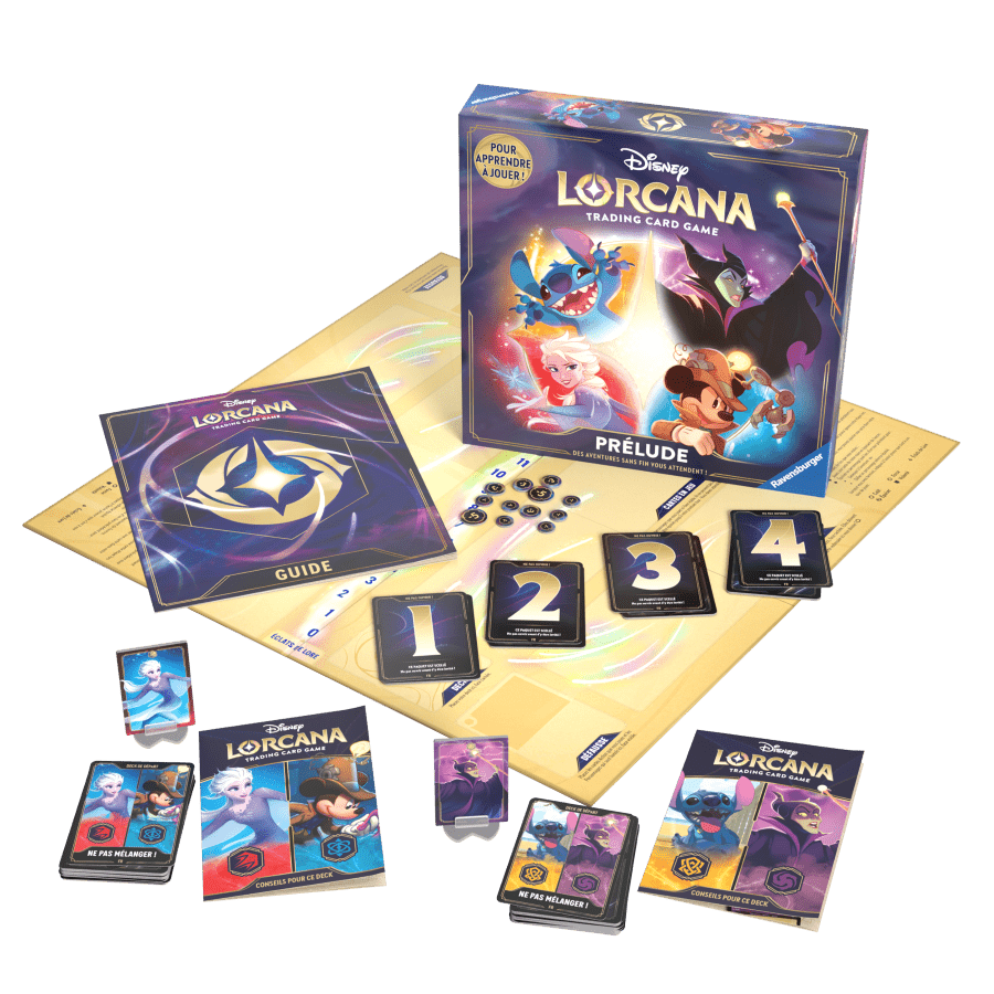 Entrez dans un royaume magiquement amusant. Ici, vous jouez aux côtés de personnages Disney bien-aimés pour mener une quête exaltante. Ce jeu s'adresse à tous et il procure tous les frissons et l'excitation que l'on peut attendre d'une aventure intemporelle Disney. Disney Lorcana Prélude est spécialement conçu pour être la meilleure façon d'apprendre à jouer. Vous pouvez vous lancer directement dans votre première quête, sans aucune expérience préalable, car la boîte contient tout ce dont vous avez besoin. Les guides inclus vous permettent d'apprendre au fur et à mesure que vous jouez, tout en développant petit à petit vos compétences sur le jeu. Le royaume de Lorcana vous appelle... rejoignez l'aventure !