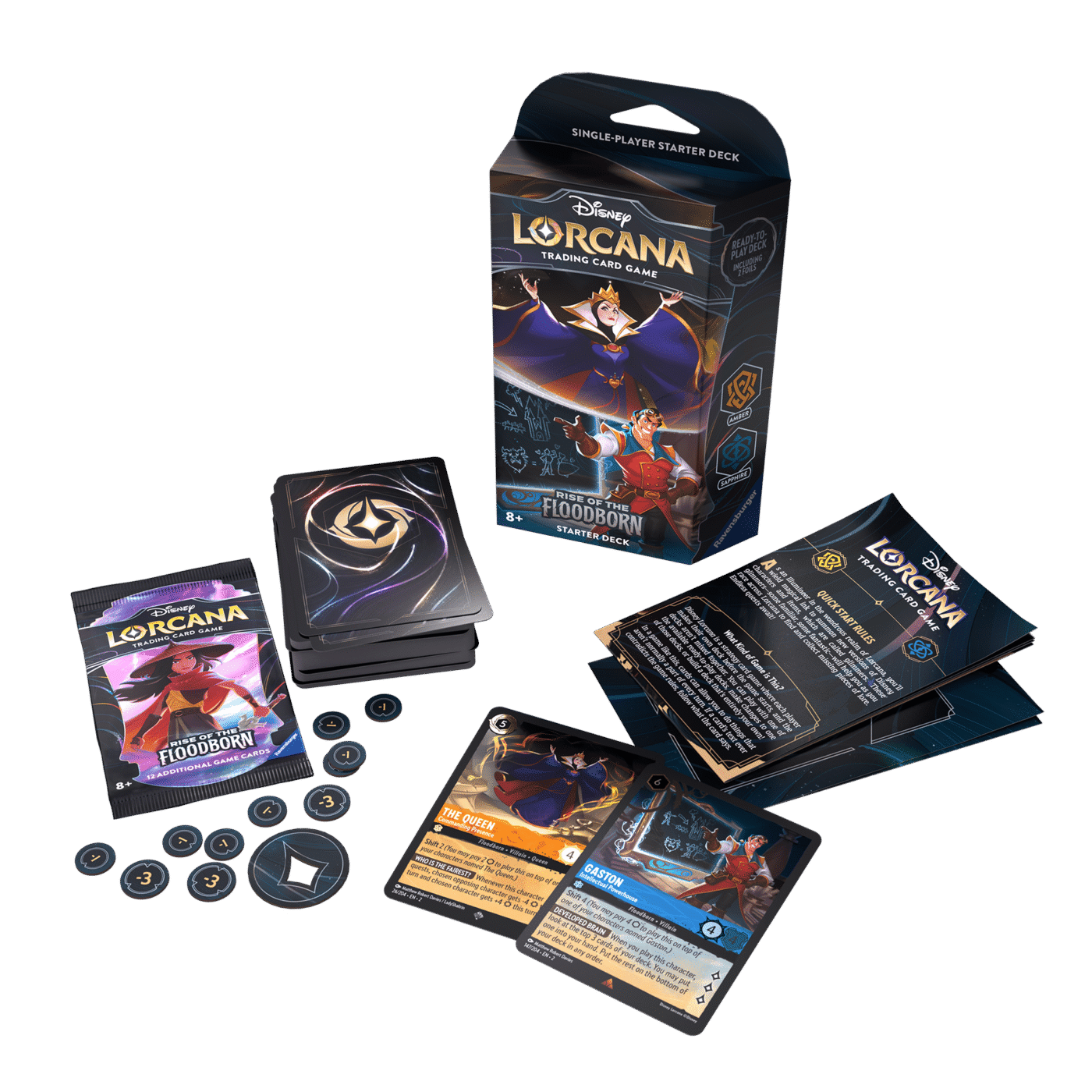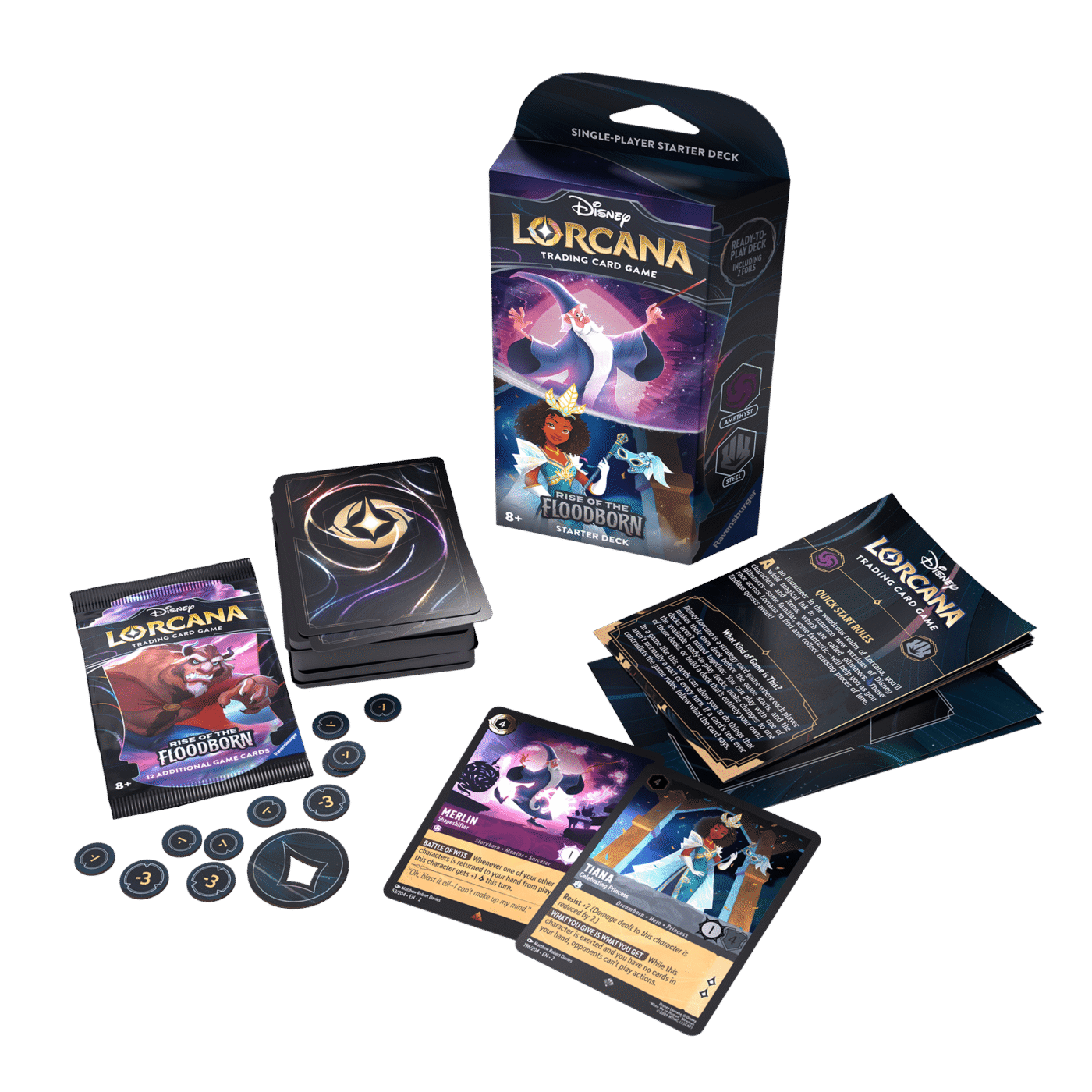 Two starter decks are available for Rise of the Floodborn. Each deck is playable right out of the box, has 60 cards, and features cards from two inks, each with distinct play styles. The two ink combinations are Amber & Sapphire and Amethyst & Steel.