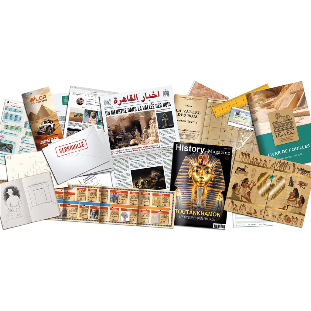 - 📚 UN DOSSIER CRIMINEL COMPLET : Contient un guide des fouilles, des transparents de la vallée des rois, des papyrus, un article de presse, des croquis, des contenus audio…