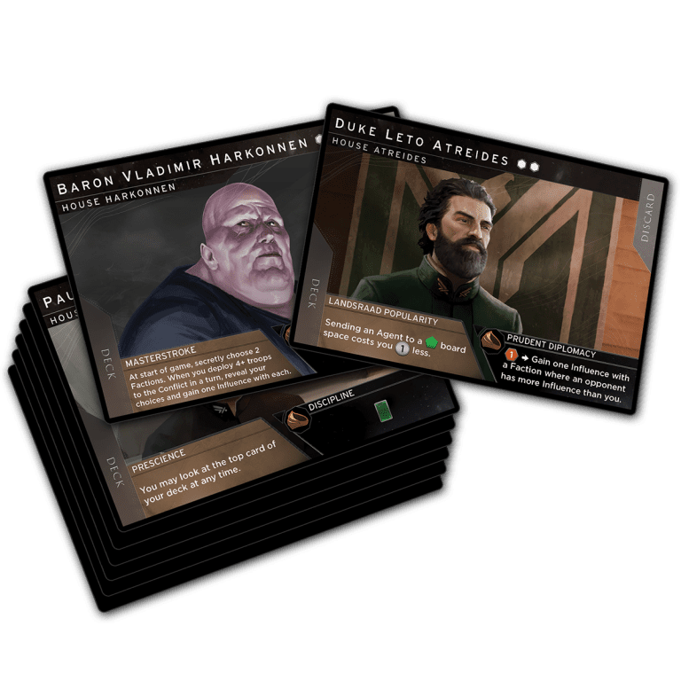 Vous commencez avec une carte de leader, et un deck identique pour tous les joueurs. Alors que vous allez acquérir de nouvelles cartes et façonner votre deck, vos choix définiront vos forces et vos faiblesses. Ces cartes vous permettent d’envoyer vos Agents sur les différents lieux du plateau de jeu, votre stratégie est donc affectée par l’évolution-même de votre deck.