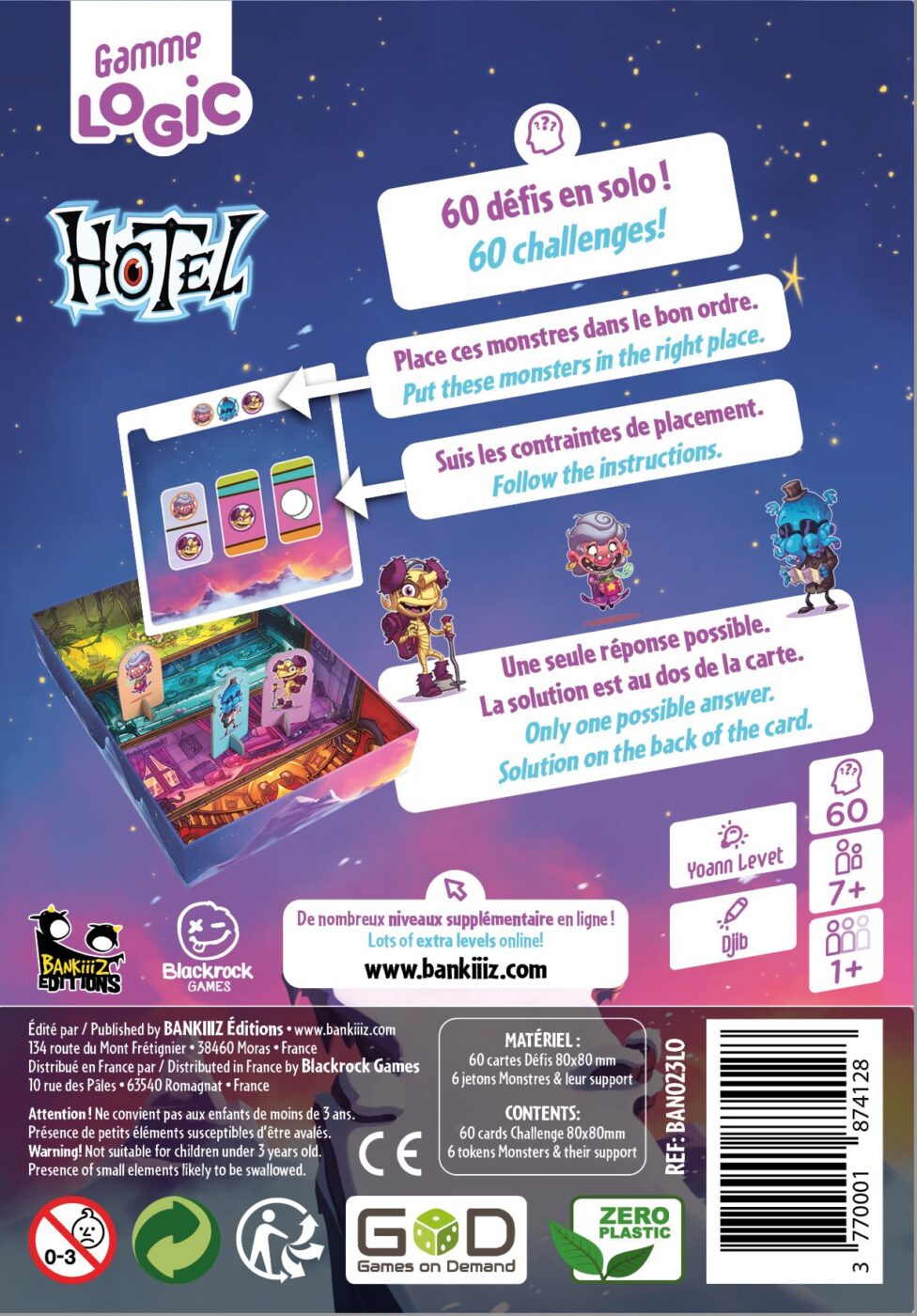 Les défis de Hotel (Gamme Logic Bankiiiz) sont basés sur les demandes de placement des clients monstrueux de l’hotel. Tous ont des demandes particulières qu’il faudrait remplir dans le but de trouver l’unique solution à chaque défis. En cumulant les différentes contraintes il faudra ainsi deviner à quel étage placer le client. Les défis sont triés par ordre croissant et permettent une progression de la difficulté et des stratégies intelectuelles à mettre en place. Que ça soit le nombre de clients ou le type de contrainte, plus les niveaux augmentent et plus la solution devient difficile à trouver.