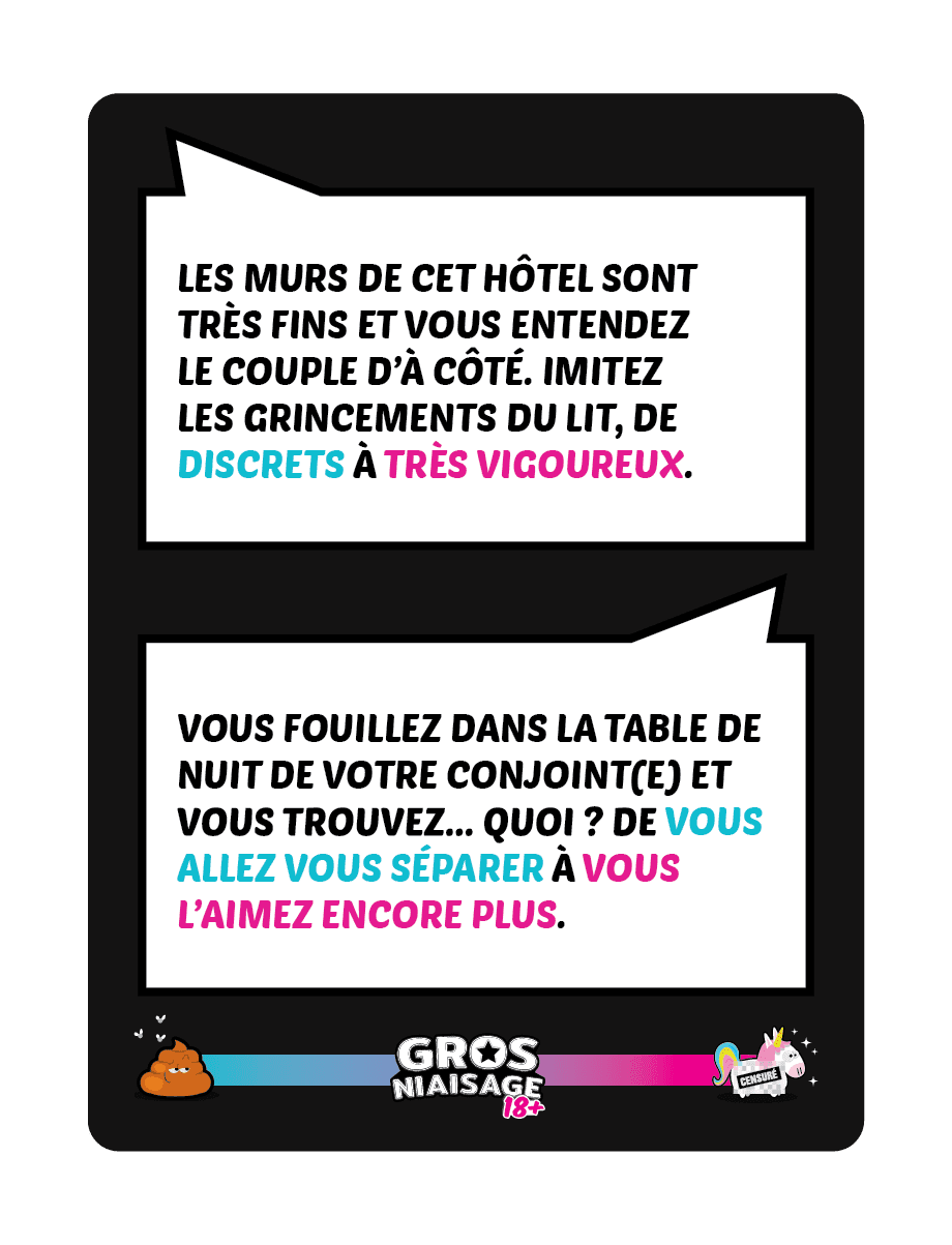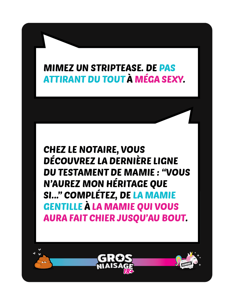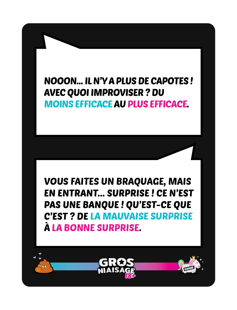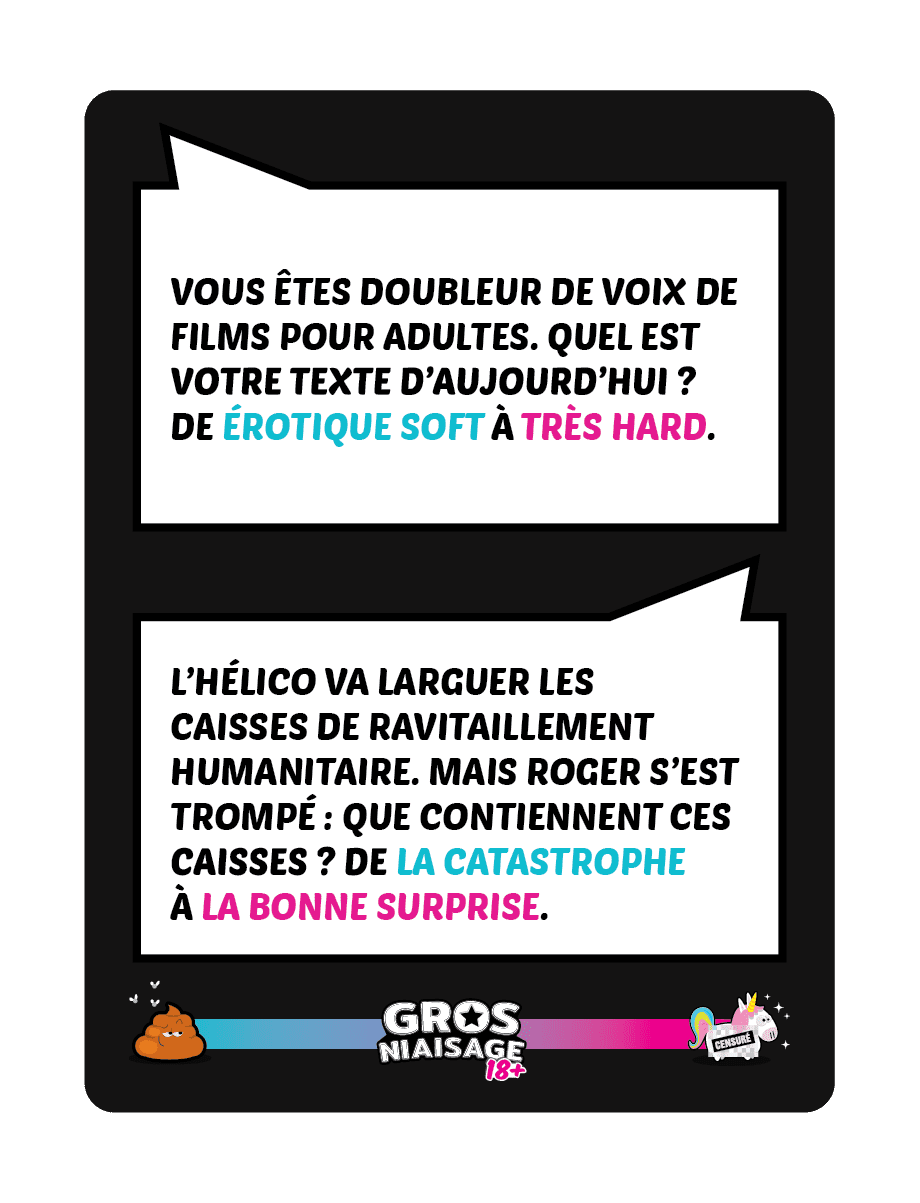 500 thèmes épicés et délirants qui vous feront inventer, raconter et mimer n’importe quoi ! Enfin un jeu où la surenchère de niaiserie est payante !