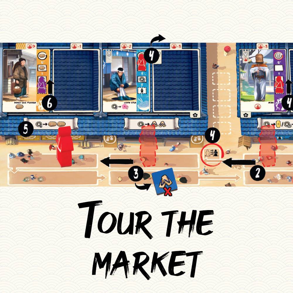 TOUR THE MARKET: Visit stalls and activate effects as you move in a circle around the board. Prioritizing moving further or sooner in turn order!