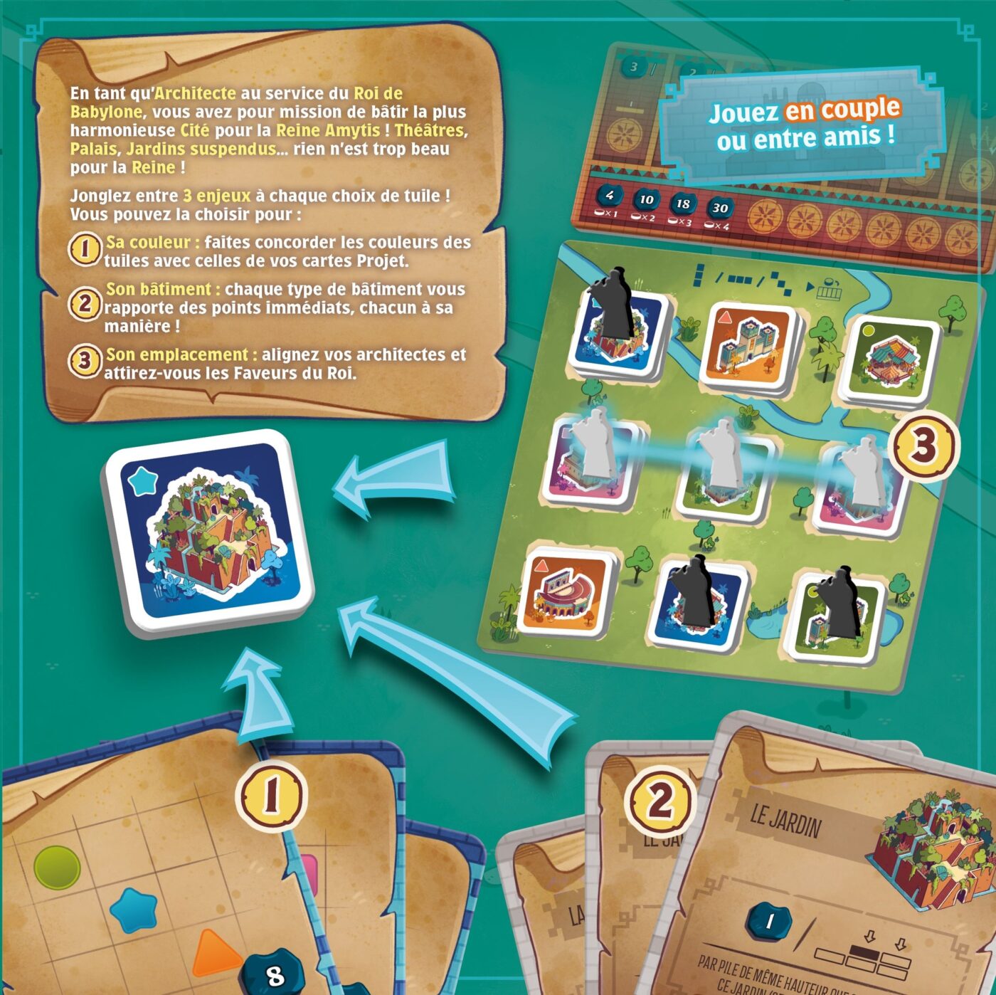 Dans Les Architectes d’Amytis, vous choisissez une des (jusqu’à 9) tuiles disponibles sur le plateau central et vous déposez immédiatement un de vos pion Architecte sur la pile correspondante. Cette pile est désormais réservée, à la manière d’un jeu de placement d’ouvrier : ni vous ni votre adversaire ne pourrez y revenir jusqu’à sa libération. Quant à la tuile choisie, vous la placez librement sur votre Plateau Cité : sur n’importe lequel des 9 emplacements (vous pouvez même librement recouvrir vos tuiles afin de créer des piles plus ou moins hautes). Une tuile présente 2 informations : un type de bâtiment, et une couleur. Marquez immédiatement des points pour le type de bâtiment lorsque vous le posez. Il y a 6 types de bâtiments, chacun d’eux possède 2 types de scoring au choix, afin de varier les parties, pour plus de rejouabilité. Les couleurs de vos tuiles vous serviront à réaliser les Projets du Roi : des cartes qu’il vous sera possible de collecter tout au long de la partie, représentant un pattern coloré. Si vous reproduisez un de ces patterns, le projet est rempli, et le Roi vous octroiera les points correspondants en fin de partie.